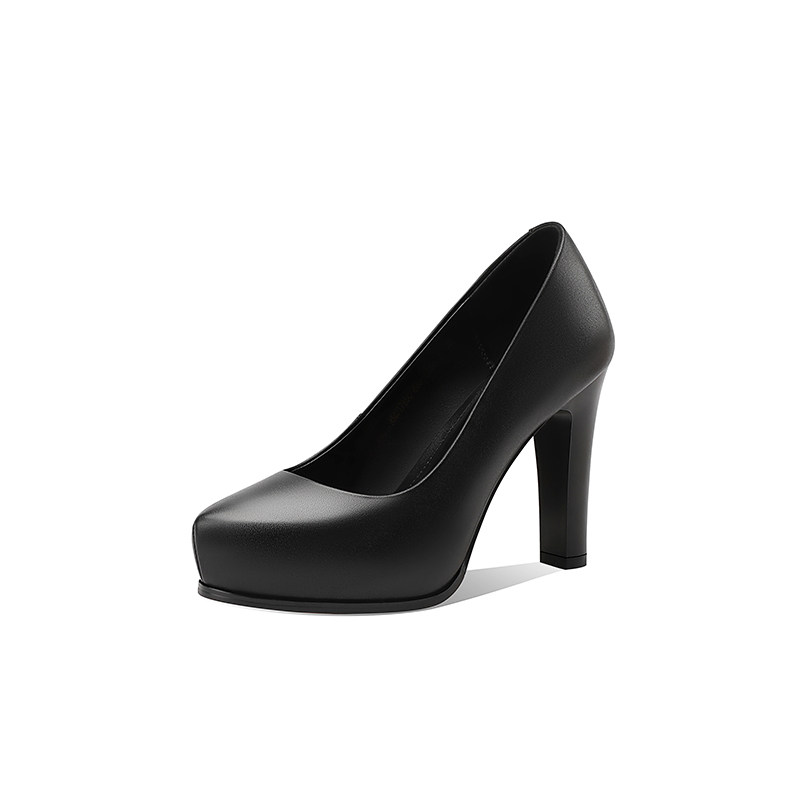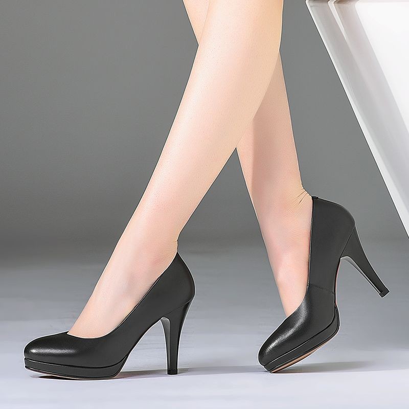 黑色正装高跟鞋女圆头防水台职业鞋面试上班细跟粗跟真皮工作皮鞋