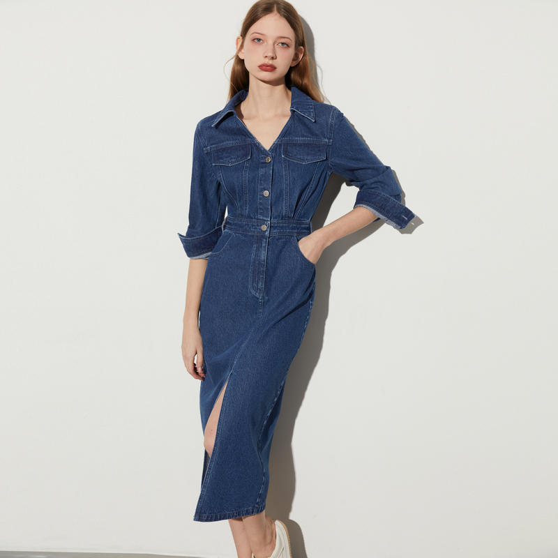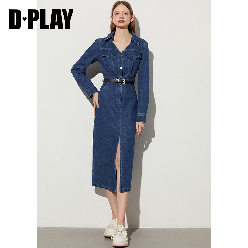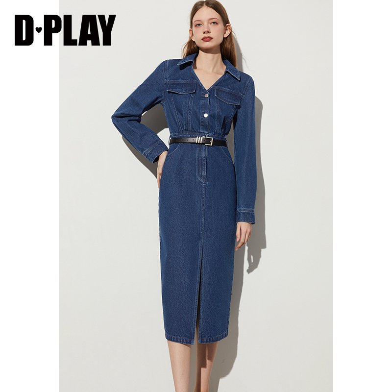 DPLAY2025年夏季新款休闲蓝色牛仔连衣裙女长袖通勤长款裙子长裙