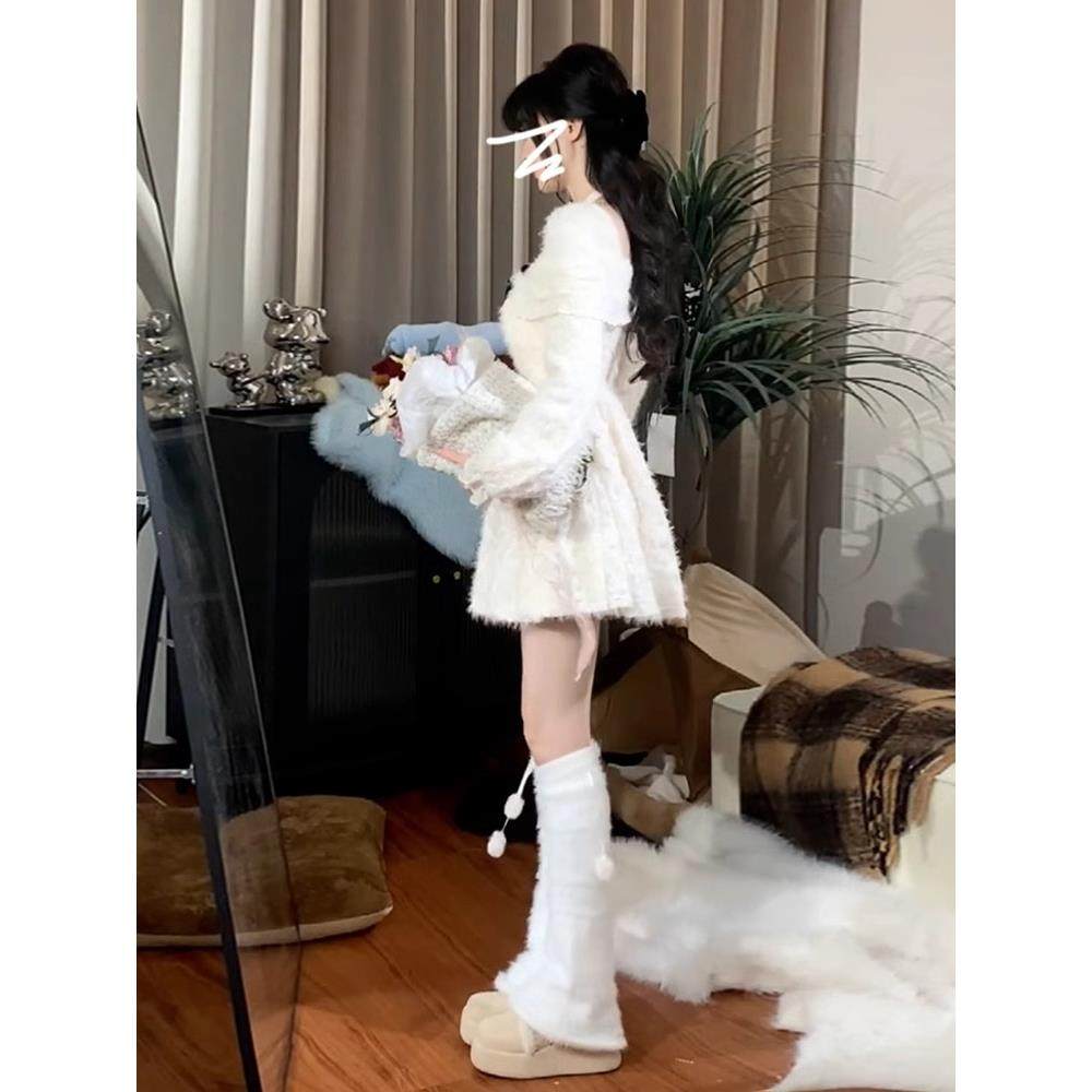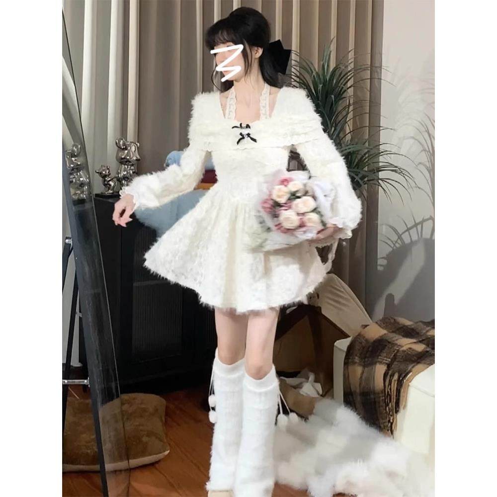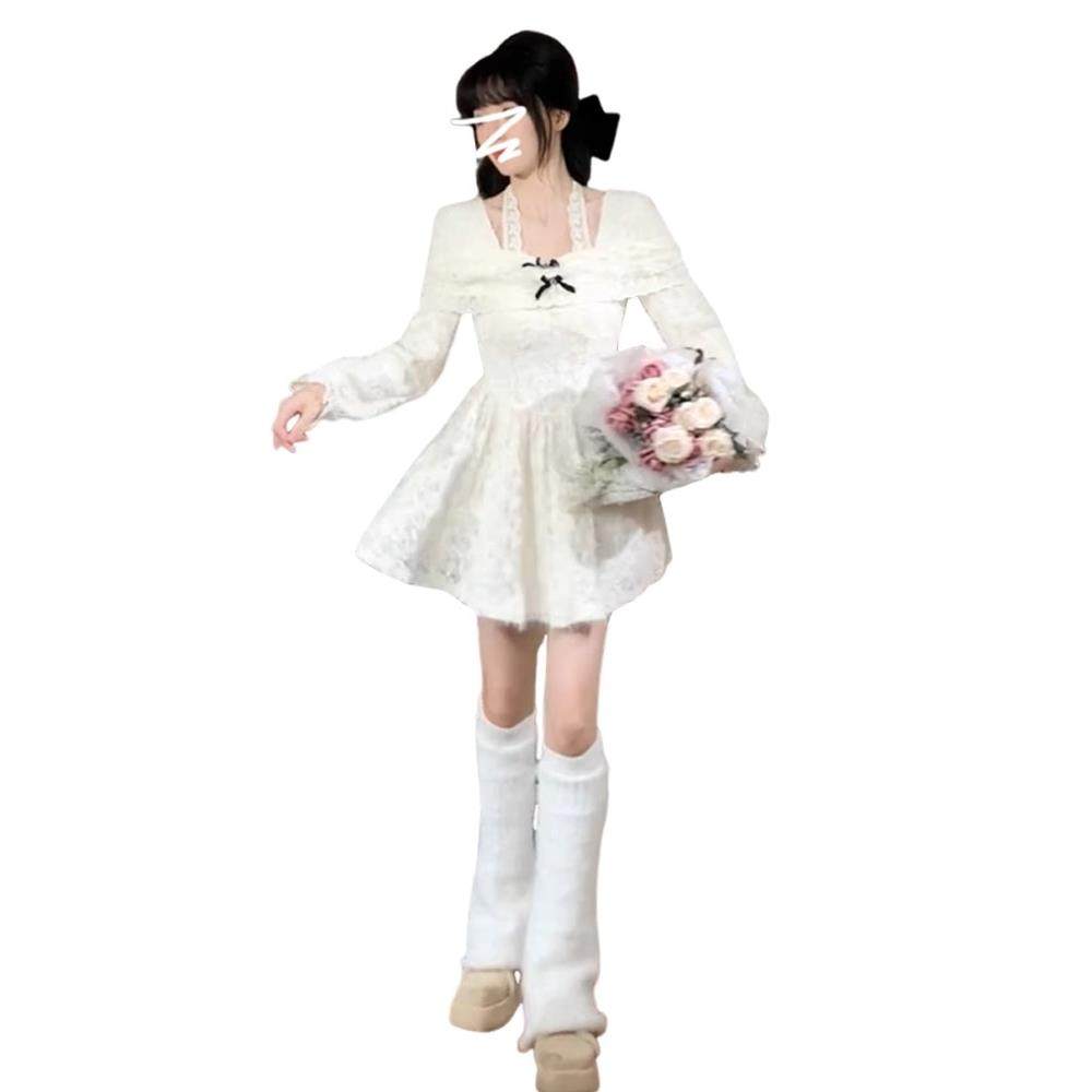 法式白色挂脖长袖蕾丝连衣裙子女早秋季高级感收腰小个子蓬蓬短裙
