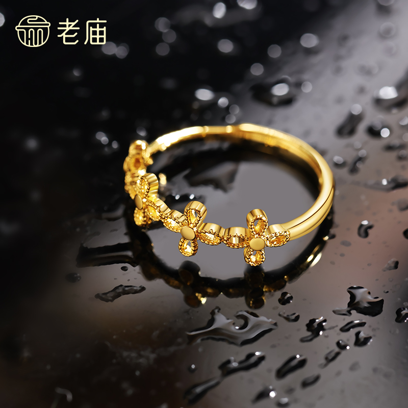 老庙黄金足金四叶草蕾丝戒指5G幸运四叶草浪漫甜美修饰指间时尚