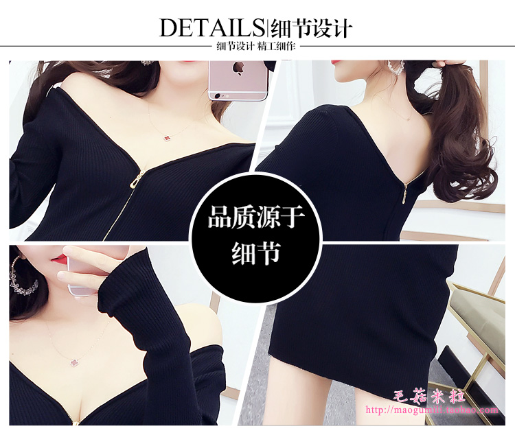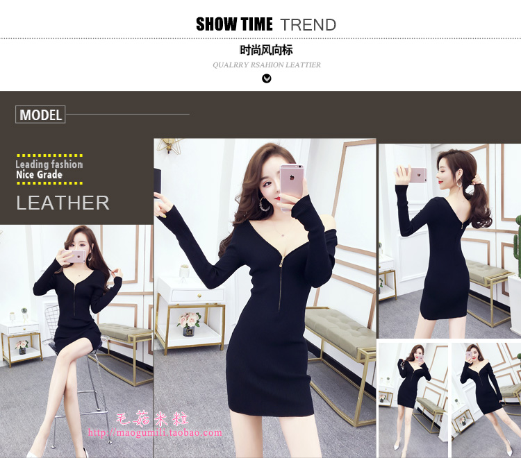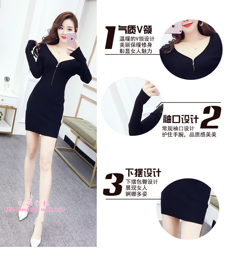 针织连衣裙女秋冬小个子v领拉链性感包臀2025新款修身打底裙内搭