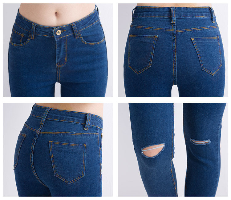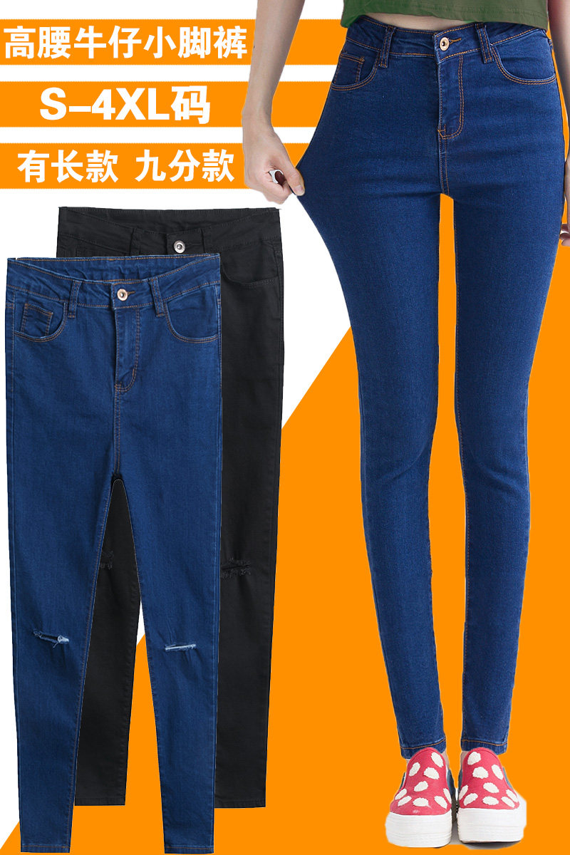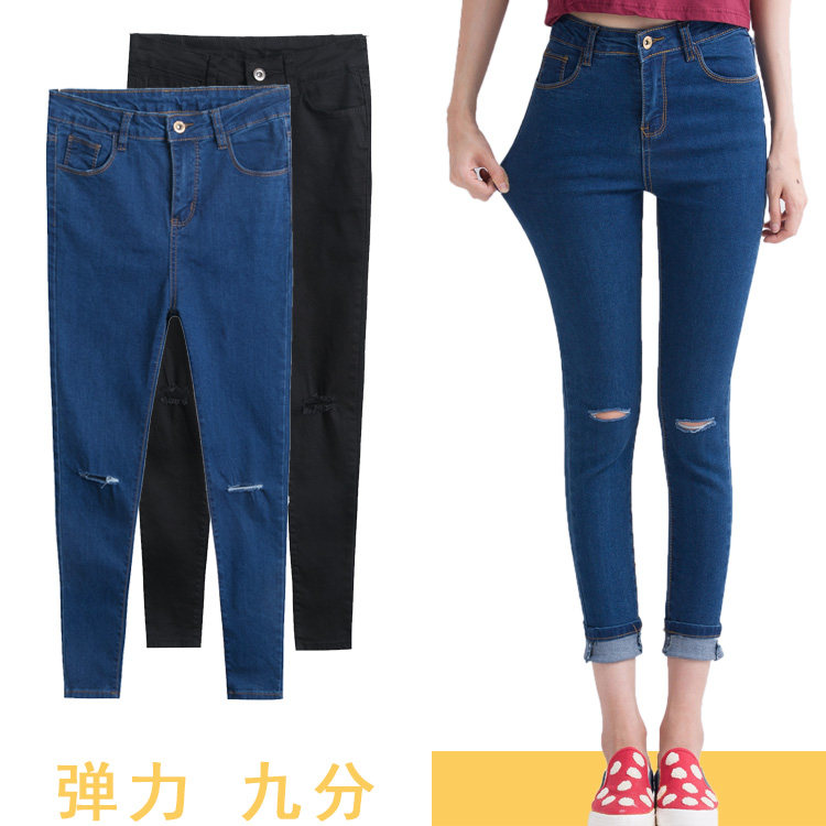 春秋高腰破洞牛仔裤女紧身黑色弹力小脚铅笔长裤弹性显瘦九分裤