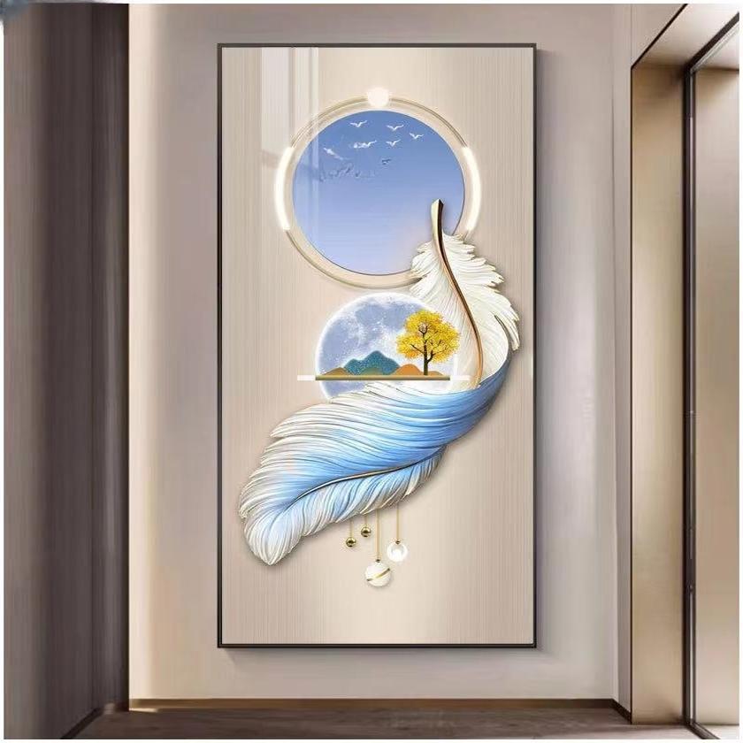 现代简约走廊过道入户玄画关梦幻羽毛竖版轻奢大气铝合金框装饰画