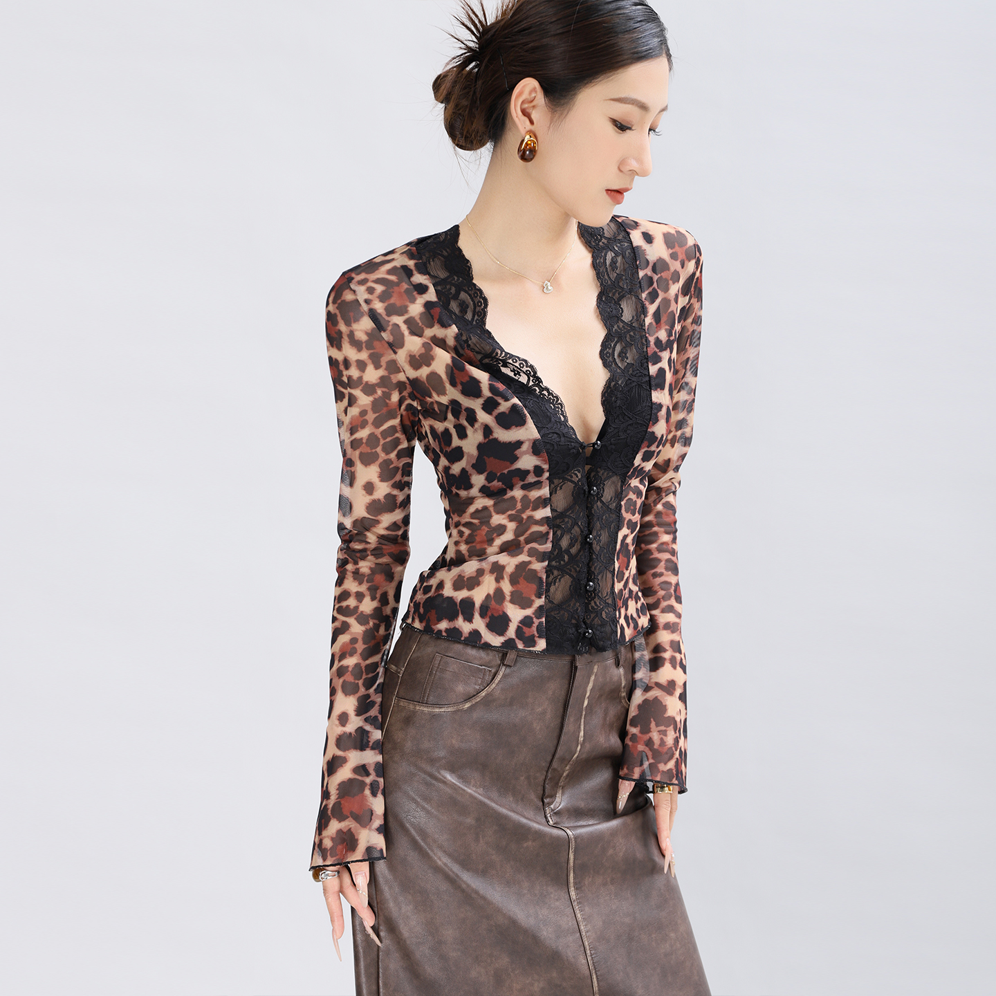 深v低胸黑色网纱上衣高级感女高端早秋薄款透视蕾丝设计感打底衫