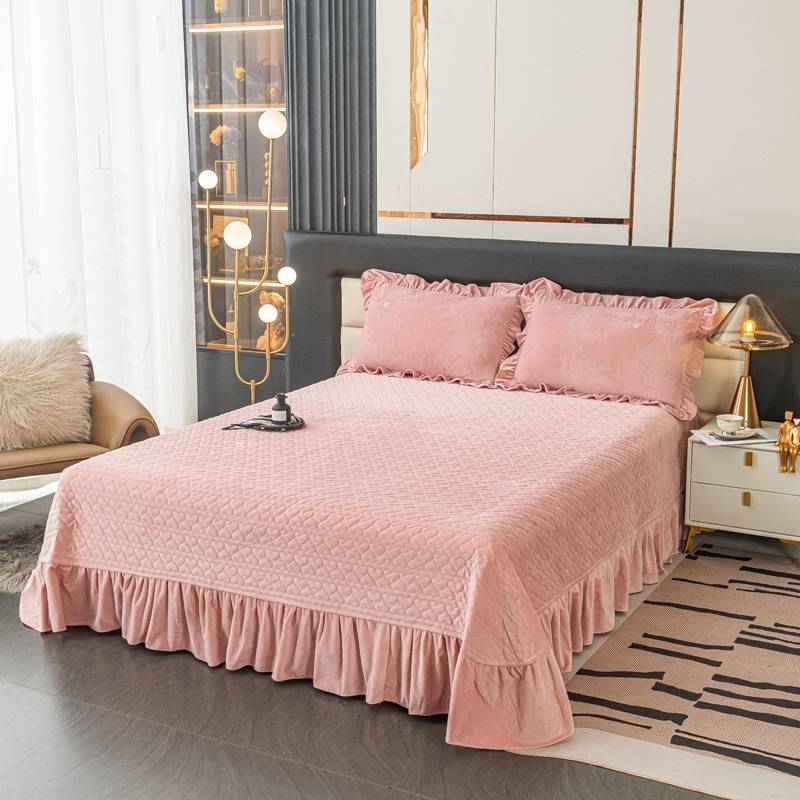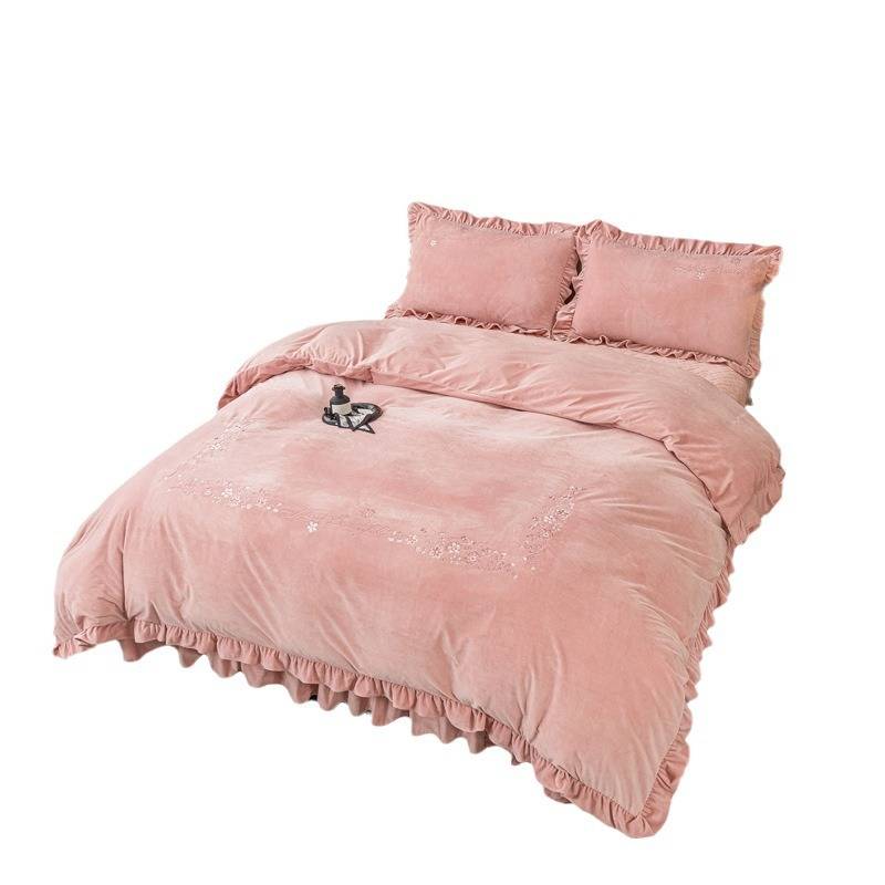 冬季宝宝绒床盖四件套纯色绣花韩版花边夹棉床上用品夹棉保暖