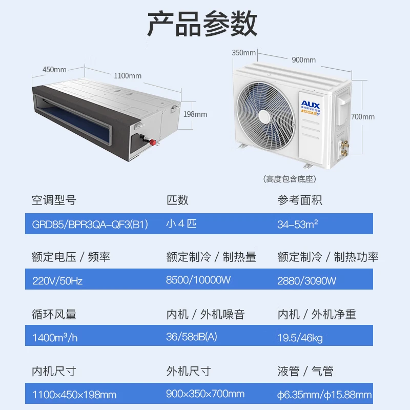 国家补贴奥克斯中央空调小4匹风管机一拖一GRD85/BPR3QA-QF3(B1)