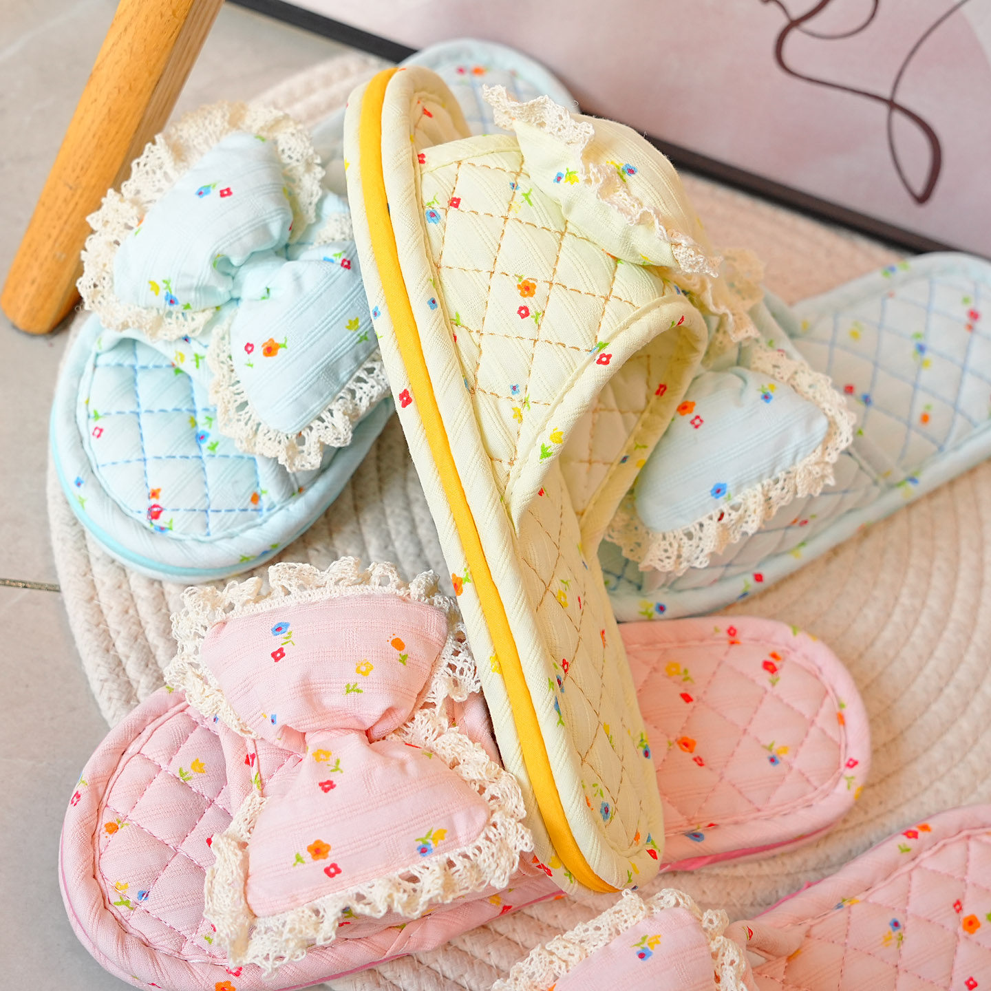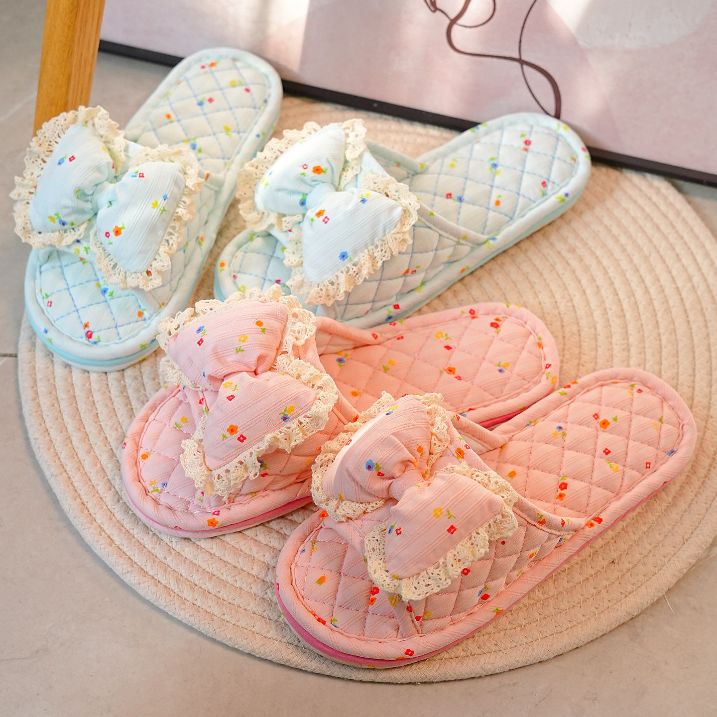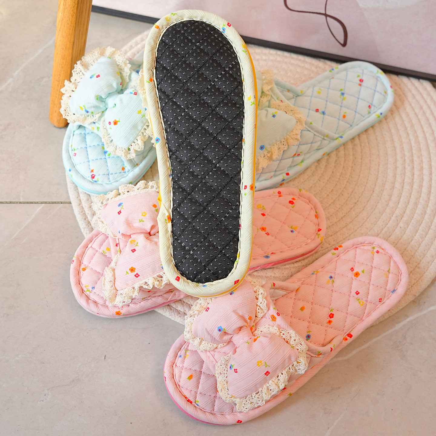 韩版公主风蝴蝶结布艺布底拖鞋女软底静音居家地板室内拖鞋四季