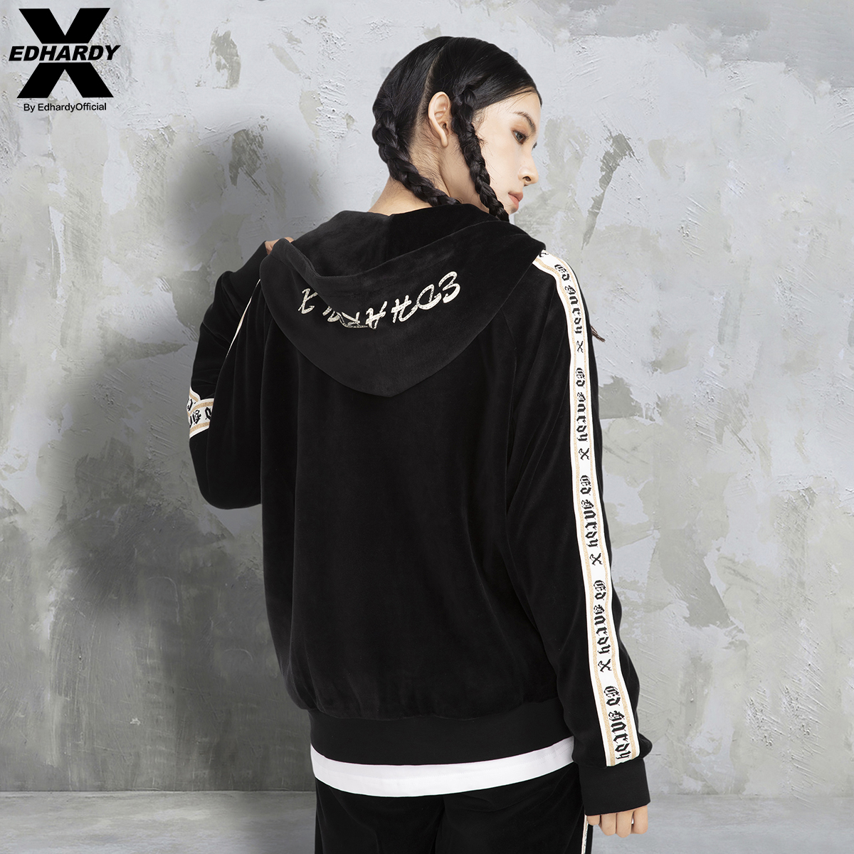 EdHardyX春秋虎头烫钻潮牌宽松黑色天鹅绒连帽男女款拉链卫衣外套