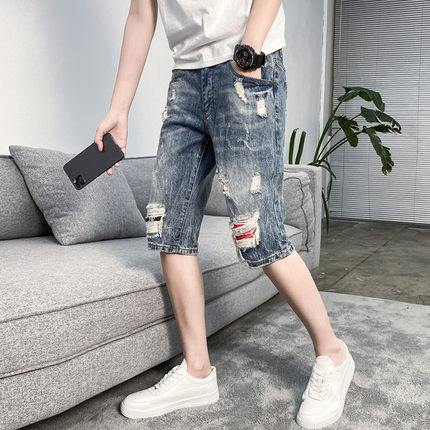 学生破洞牛仔短裤五分男士韩版潮流夏季薄款直筒乞丐刮烂七分裤子