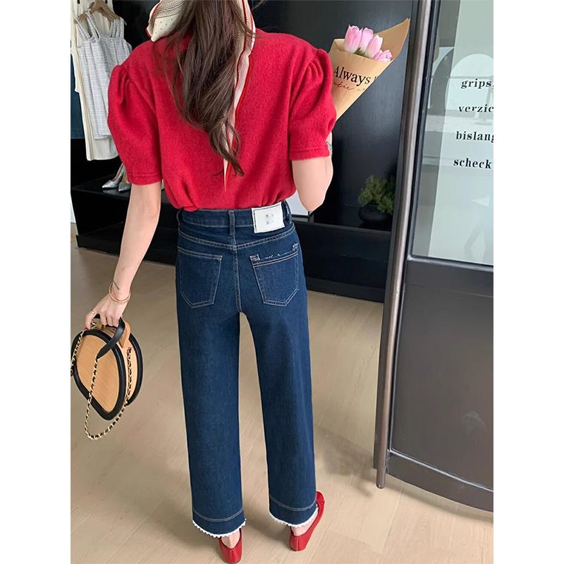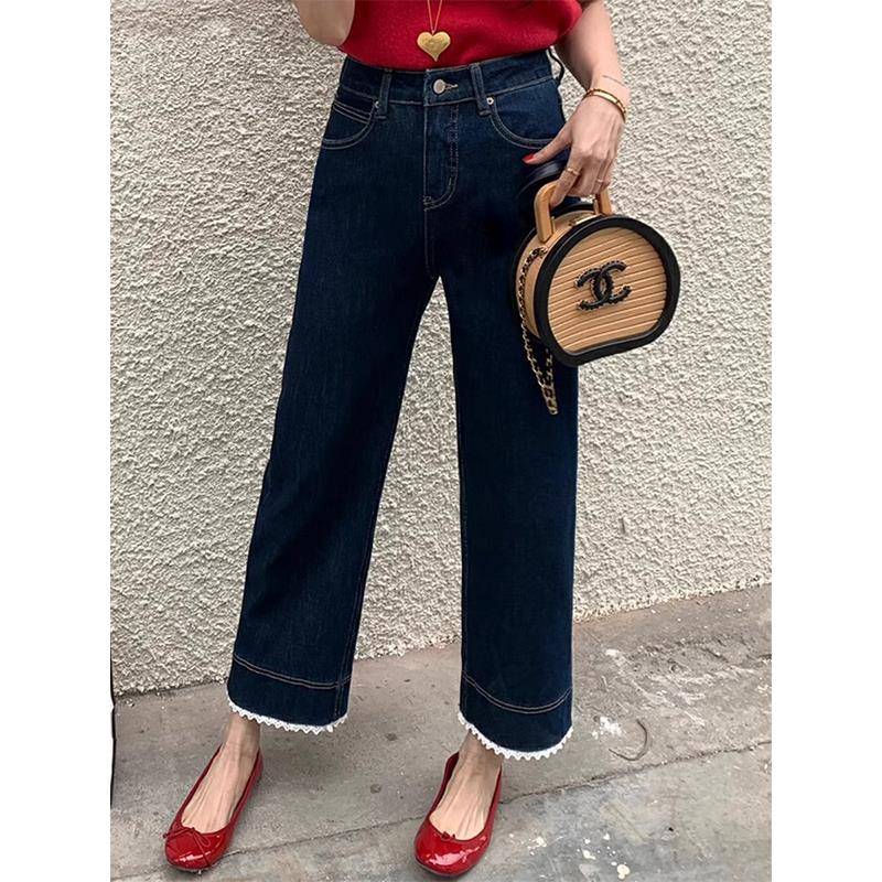 春季新款蕾丝拼接直筒裤女大码梨形身材显瘦弹力小个子九分牛仔裤
