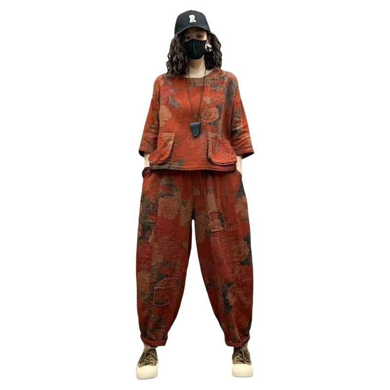 春季新款复古棉麻休闲套装女圆领宽松大兜上衣松紧腰哈伦裤两件套