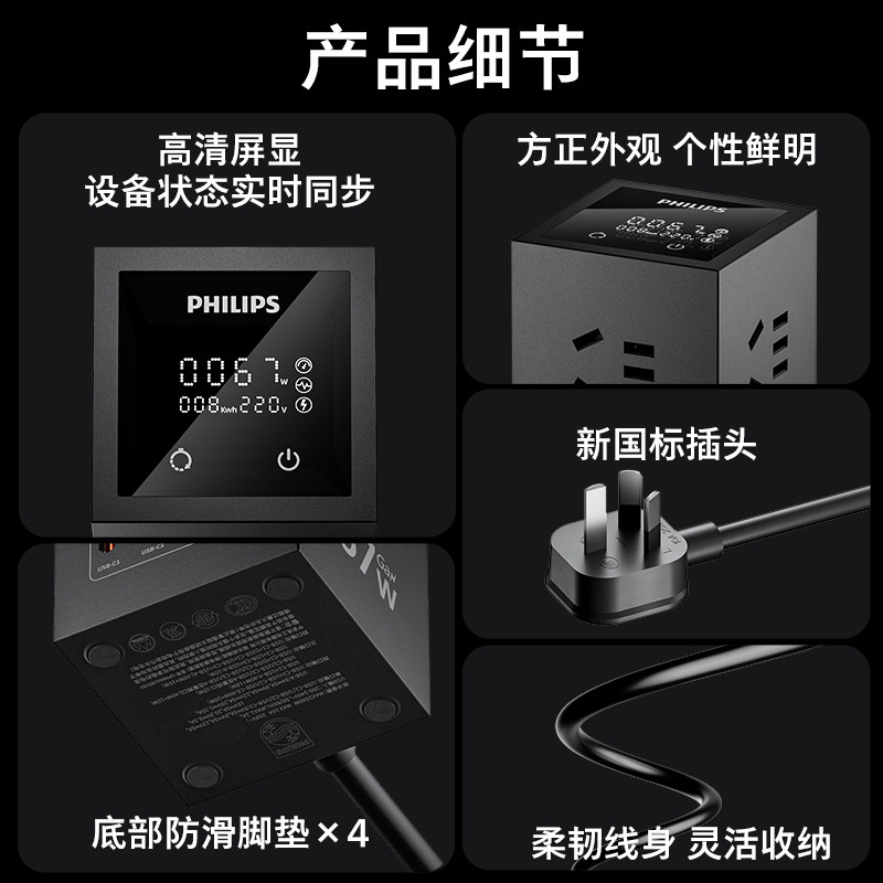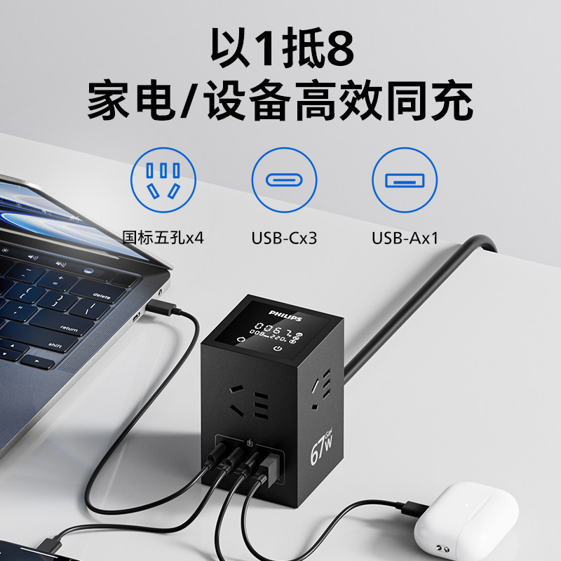 飞利浦氮化镓67W桌面充电站带数显多功能接线板排插立式快充插座