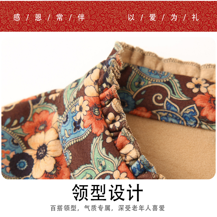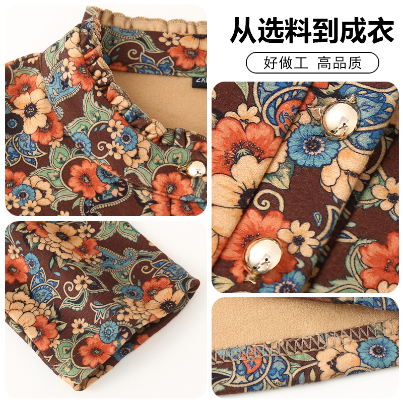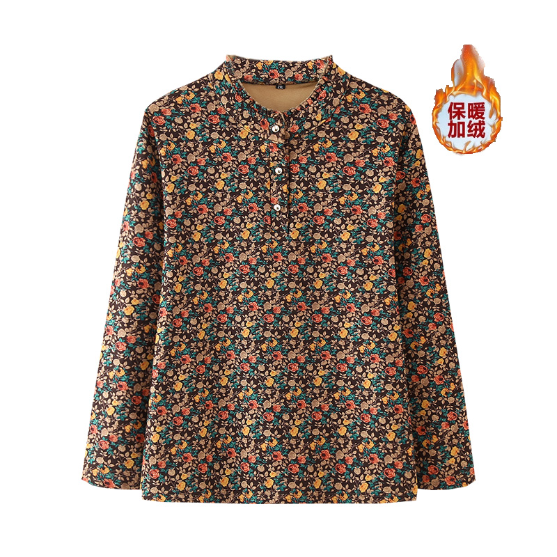 加绒加厚冬装新款印花立领套头打底衫中老年妈妈宽松T恤长袖上衣