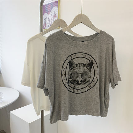 欧美风夏季莫代尔露脐罩衫女木代尔可爱猫咪印花宽松T恤女AA风短T