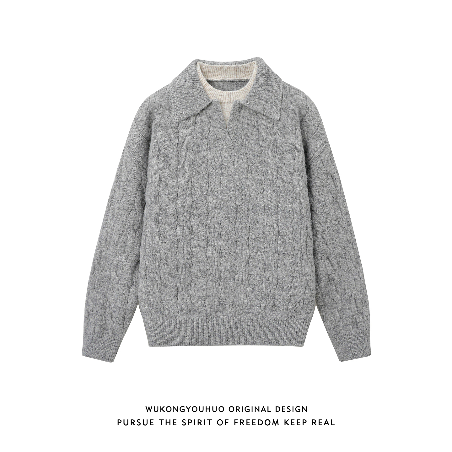 悟空有货复古绞花假两件拼接POLO领毛衣男秋冬潮牌情侣休闲针织衫