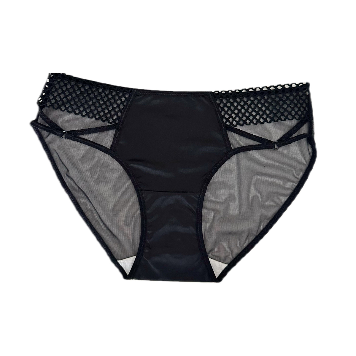 法式纯欲风~黑色女士低腰性感高开叉网纱蕾丝缎面镂空女生内裤女