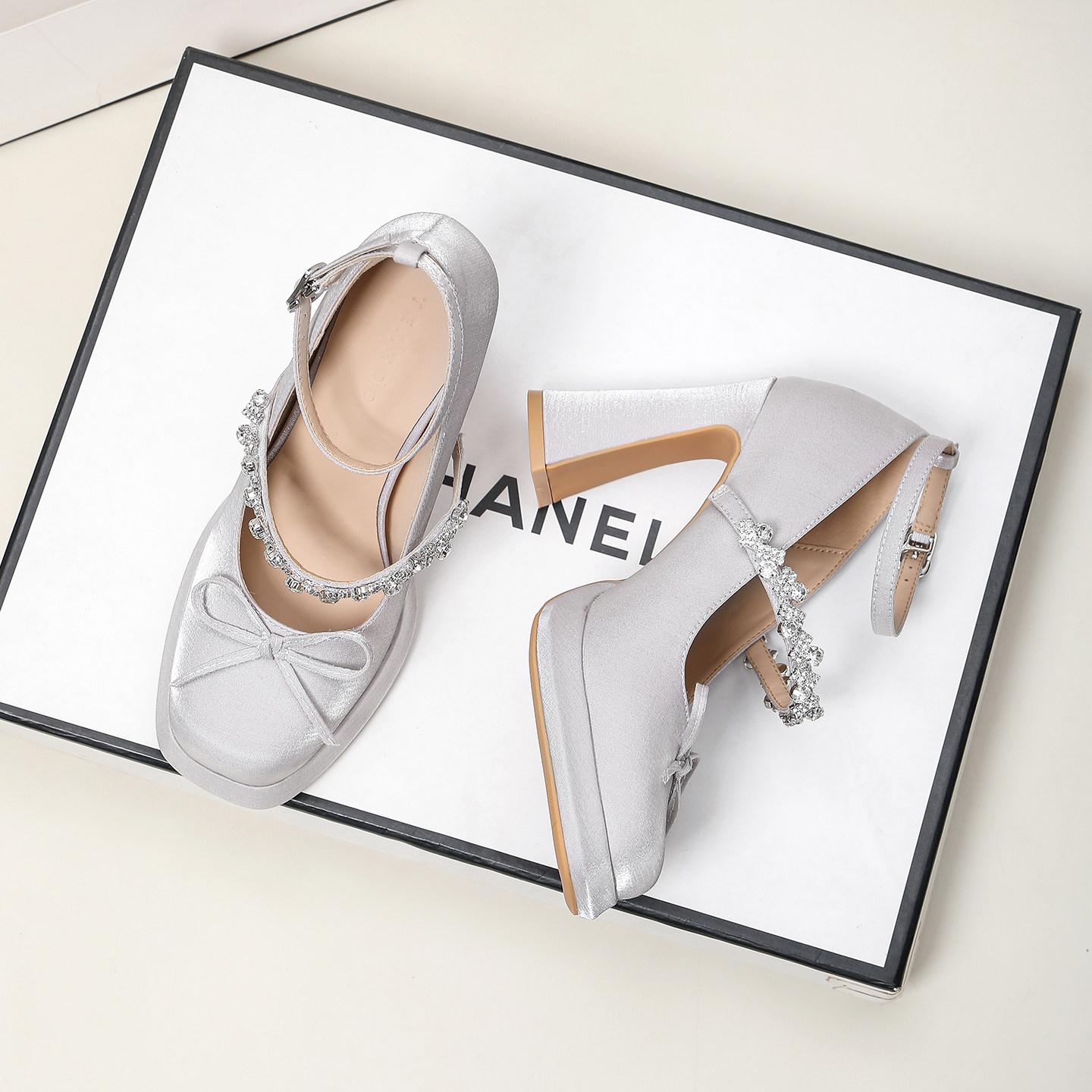 法式绸缎玛丽珍鞋粗跟水钻高跟鞋