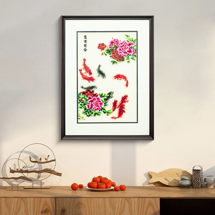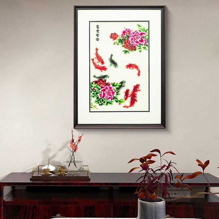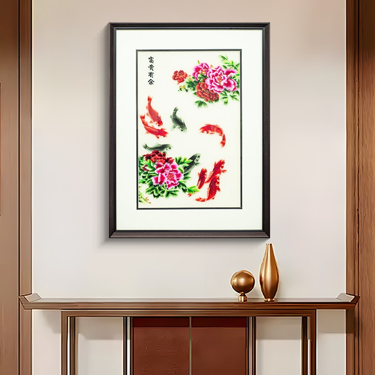 苏绣竖版牡丹纯手工刺绣新中式餐客厅背景过道装饰画九鱼锦鲤6080