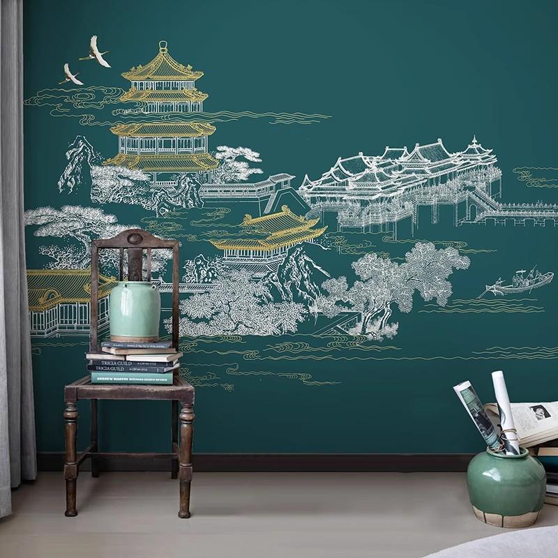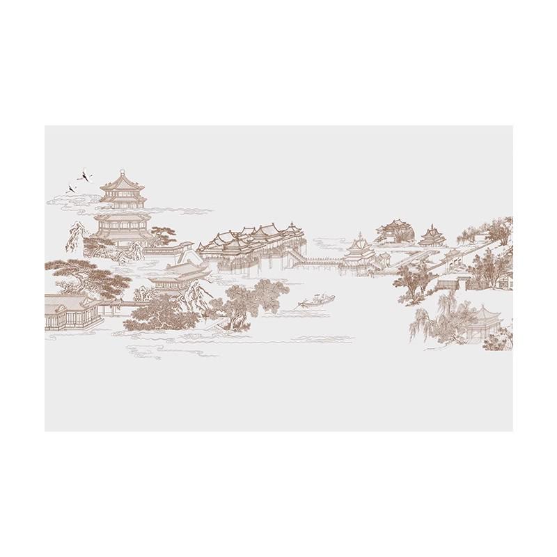 3d新中式大气古典线描阁楼壁纸客厅背景墙纸壁布酒店民宿茶室壁画