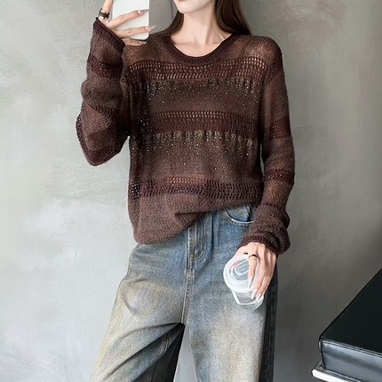 2025秋季镂空松驰感长袖毛针织衫女士宽松圆领套头打底衫烫钻时尚