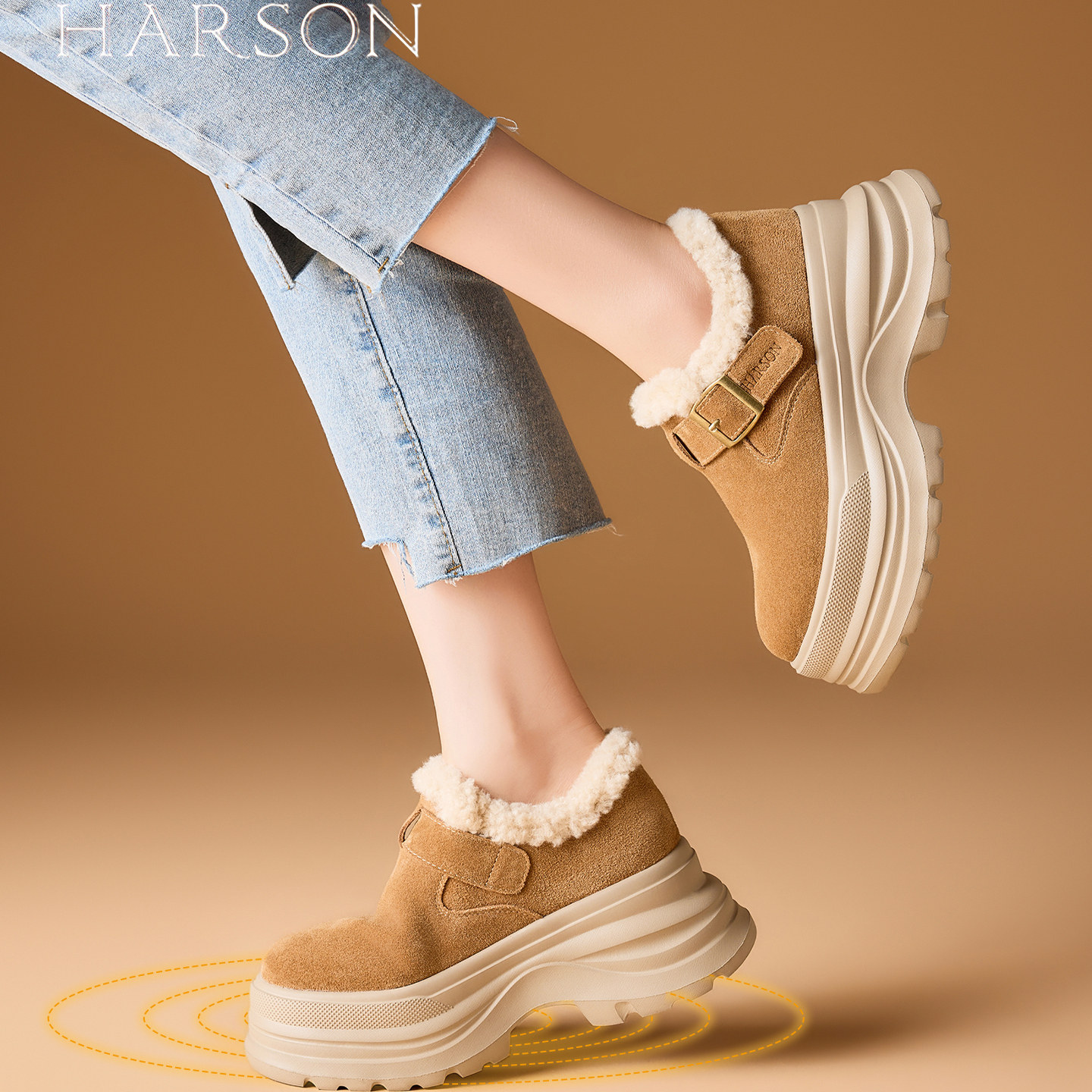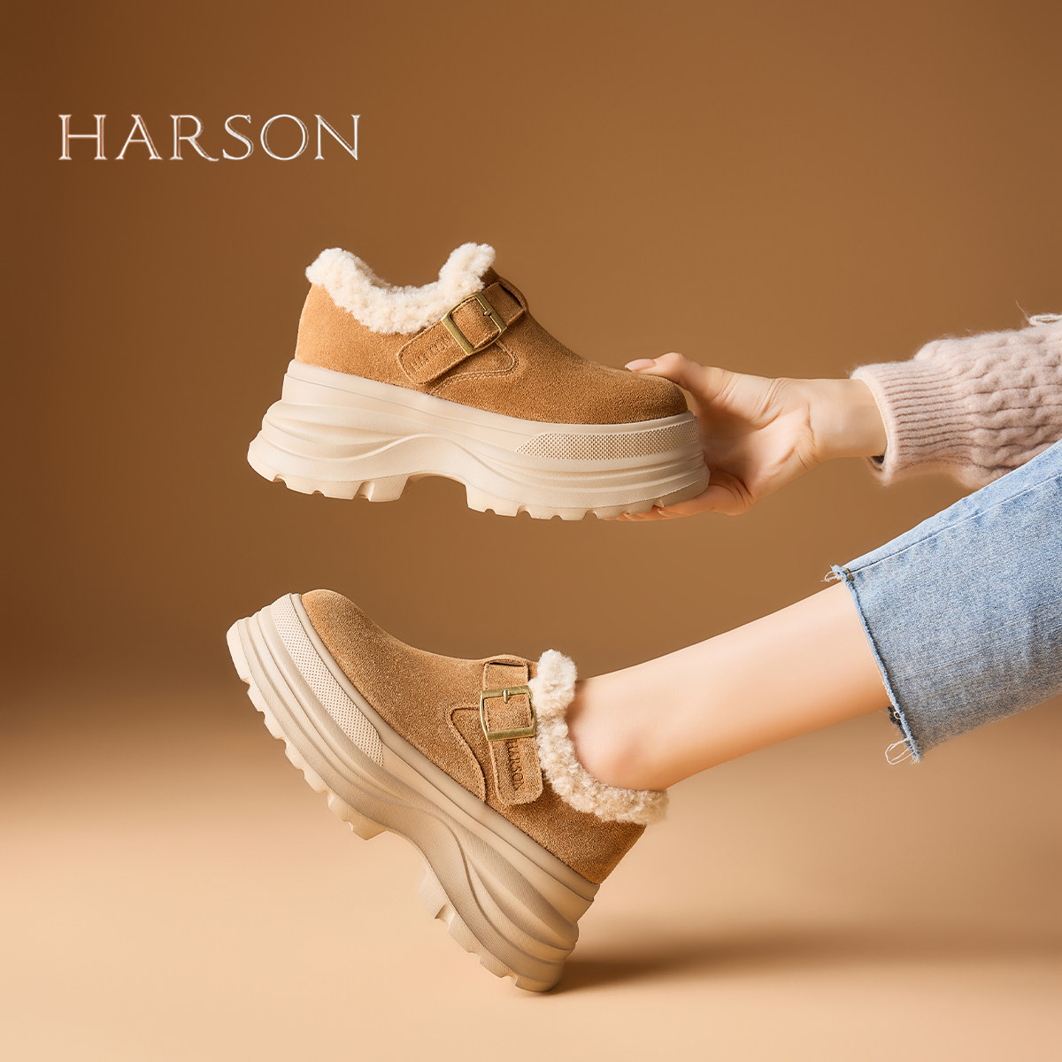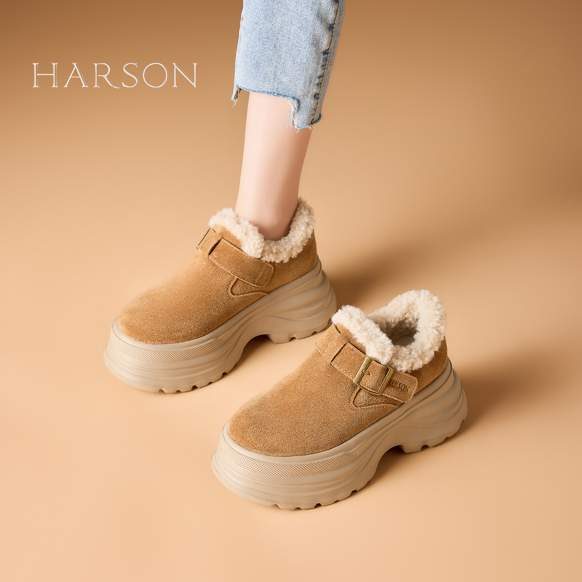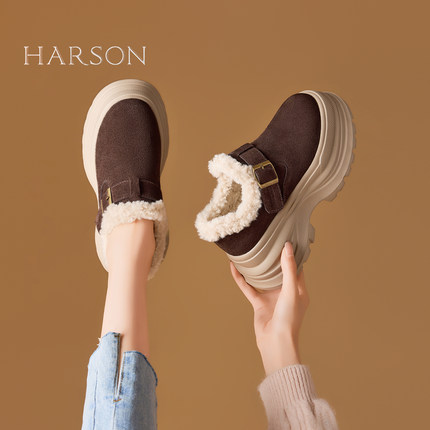 哈森复古厚底勃肯鞋女鞋子2025新款冬季爆款加绒保暖增高毛绒棉鞋