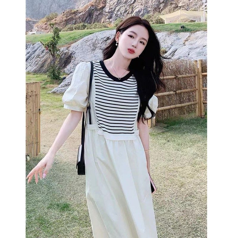孕妇装连衣裙女2024新款条纹拼接裙子宽松大码显瘦过膝中长款夏装