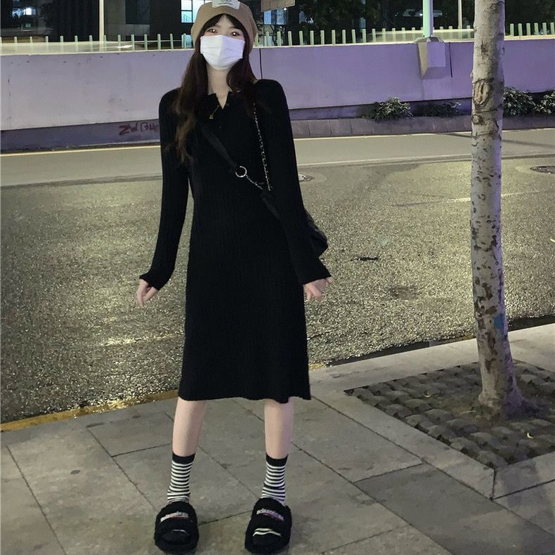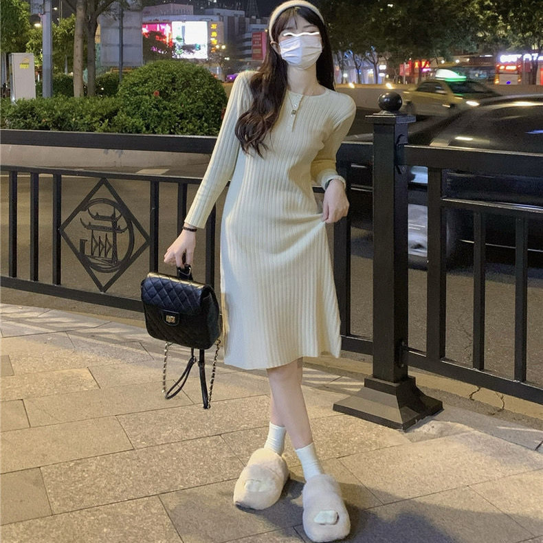 配大衣的针织连衣裙女秋冬新款长款过膝长裙修身内搭长袖打底裙子