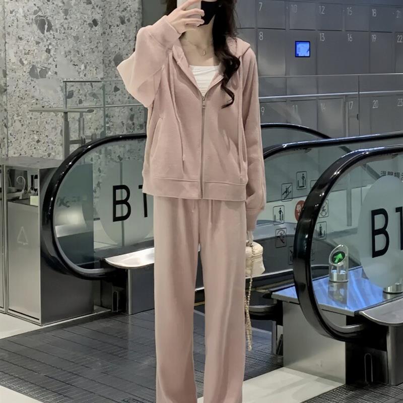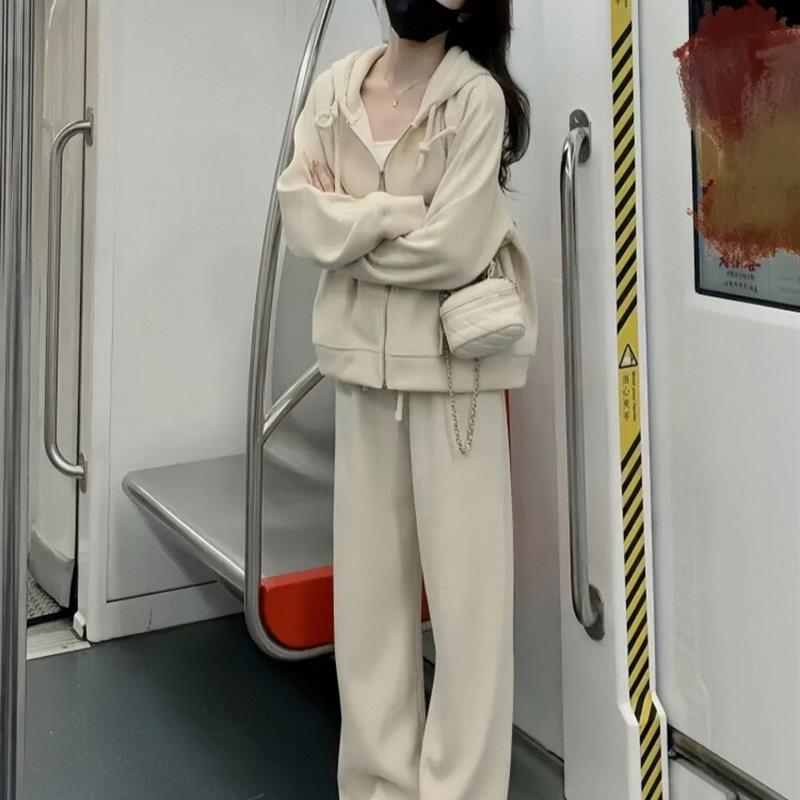 气质休闲女装套装春秋季新款宽松修身连帽运动衫夹克阔腿裤两件套