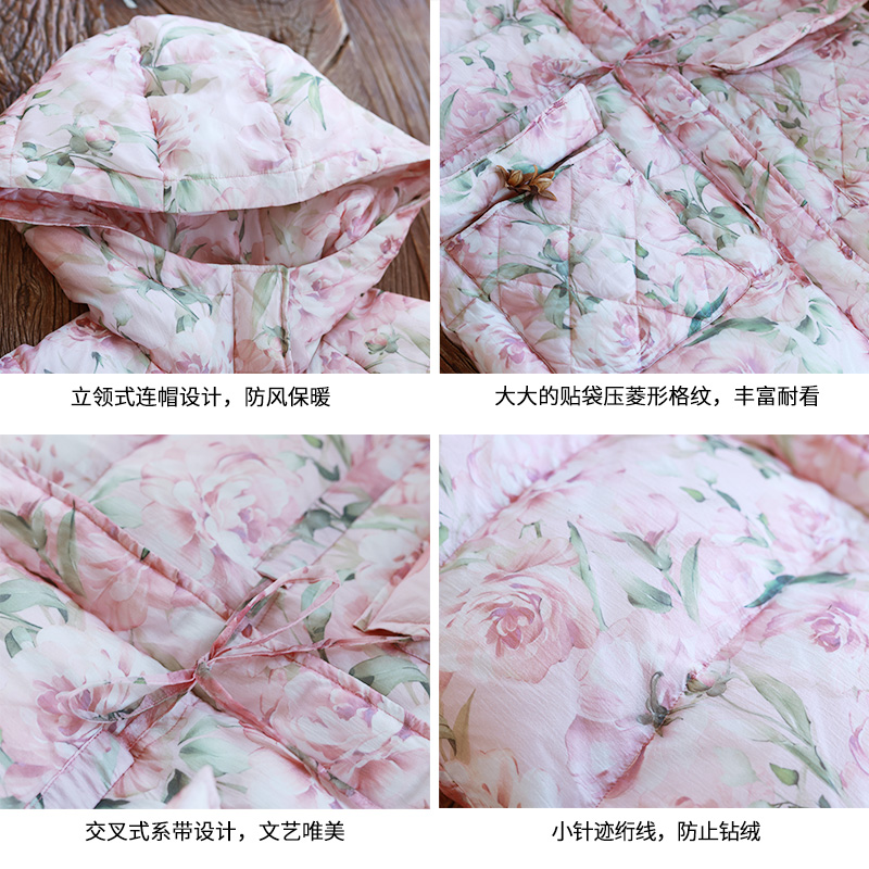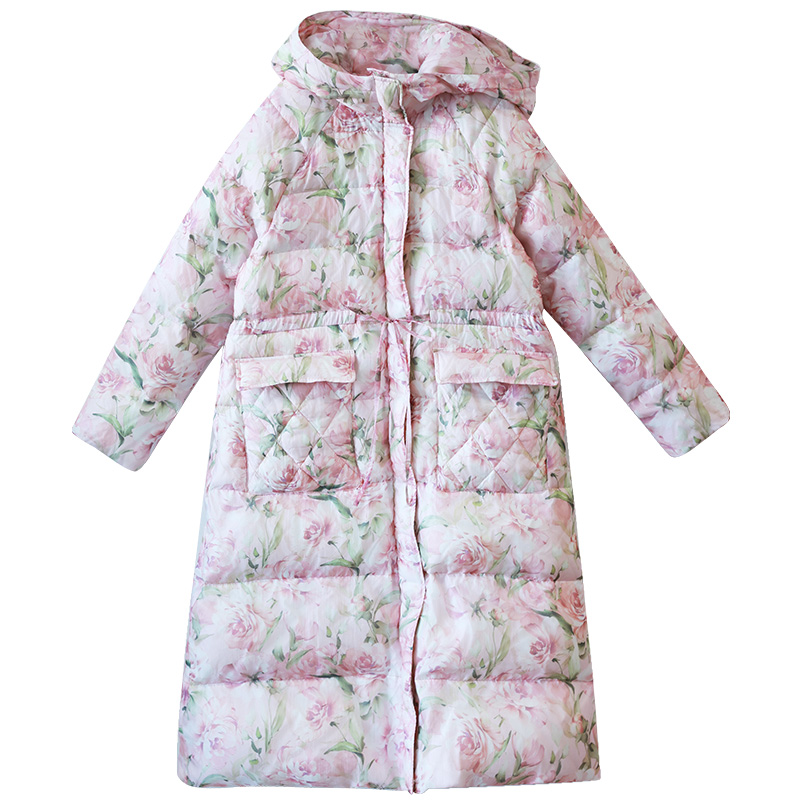 【繁花之境】连帽粉色印花羽绒服女士长款冬季加厚收腰白鸭绒外套