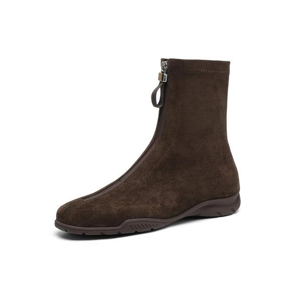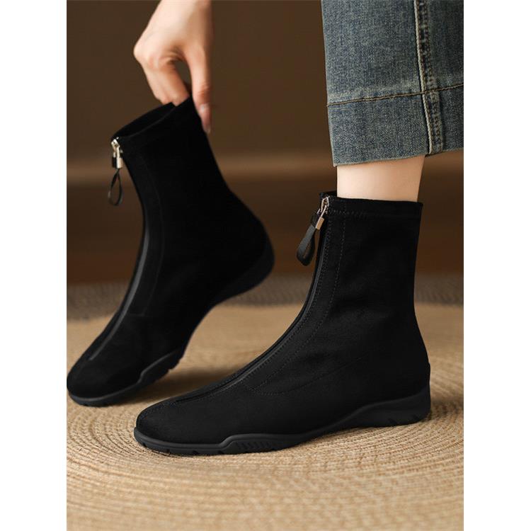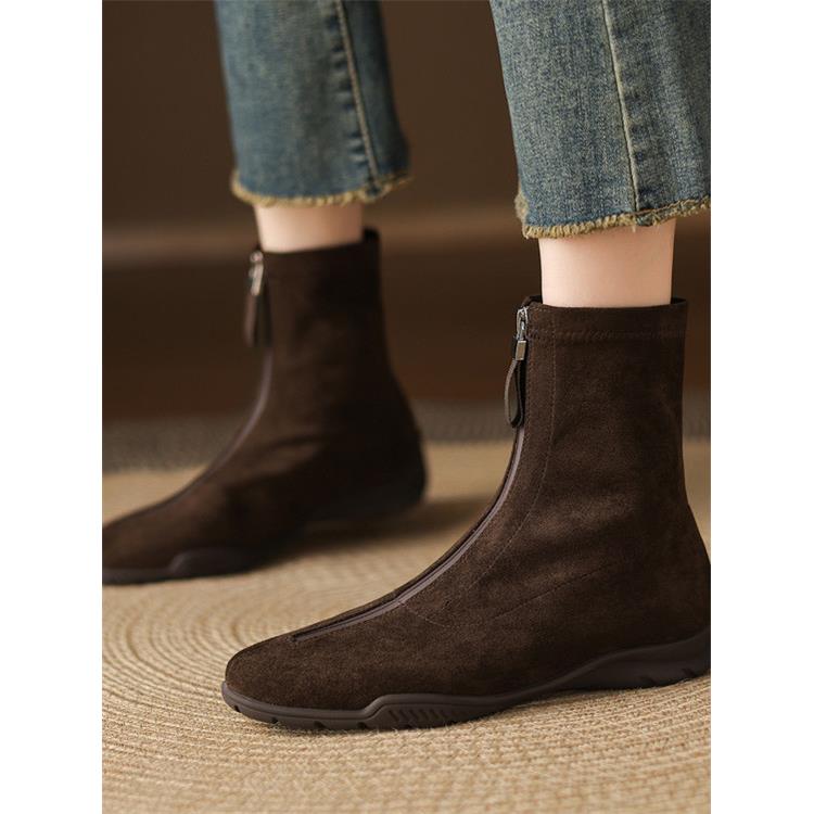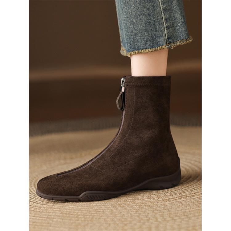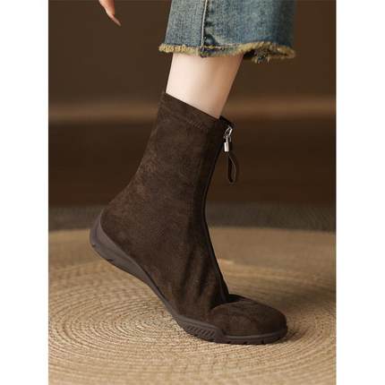 翻毛皮短靴女春秋单靴软底圆头中跟平底靴粗跟绒面40大码41弹力靴