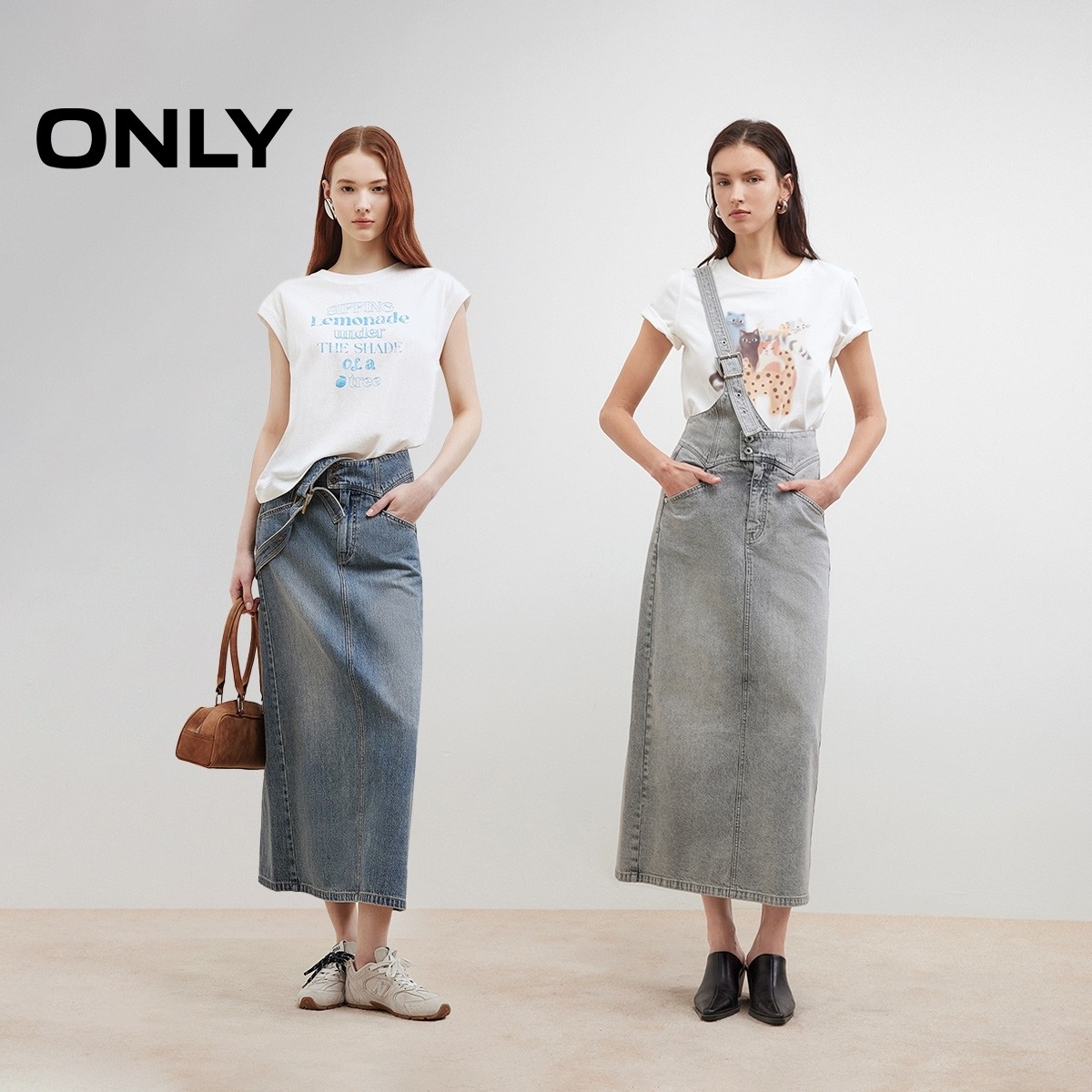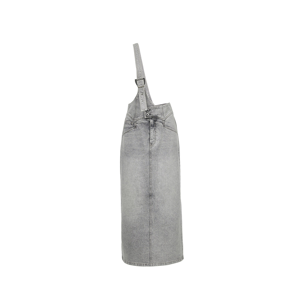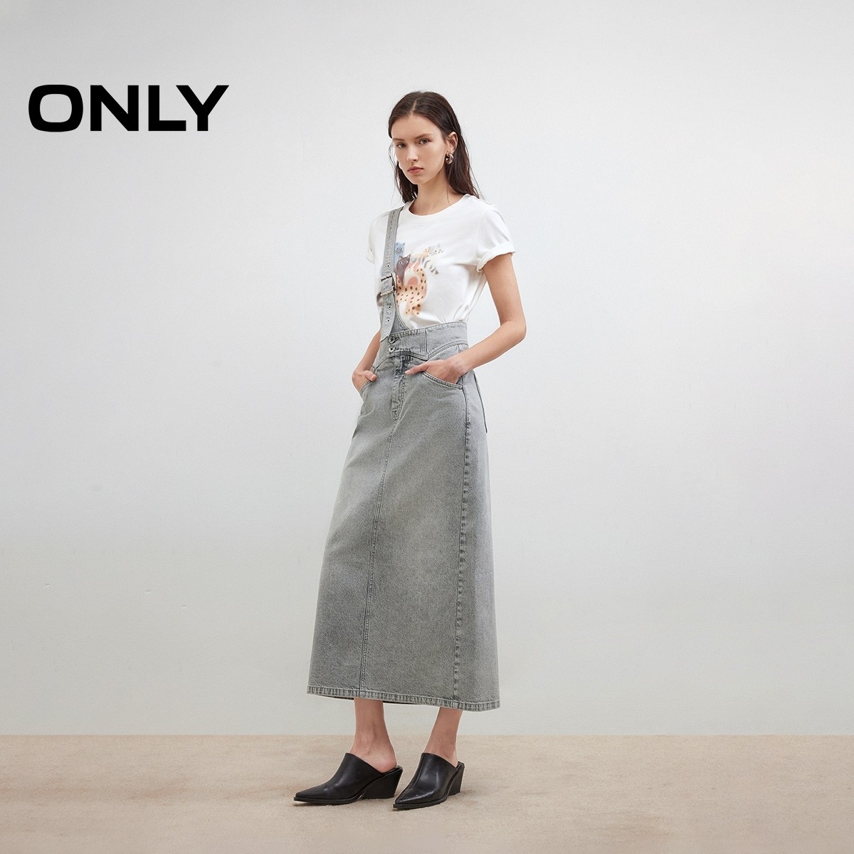 绫致ONLY25夏季性感后开衩设计牛仔直筒斜肩带背带裙连衣裙女