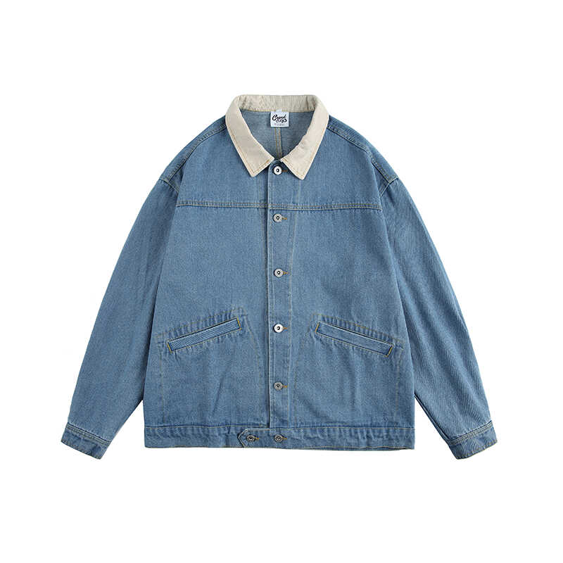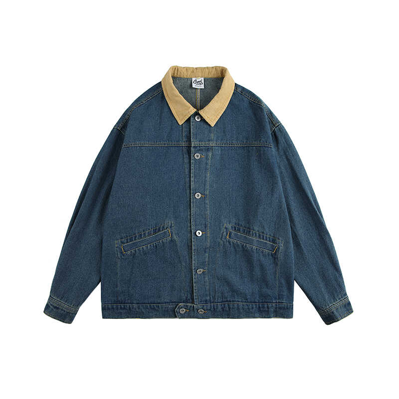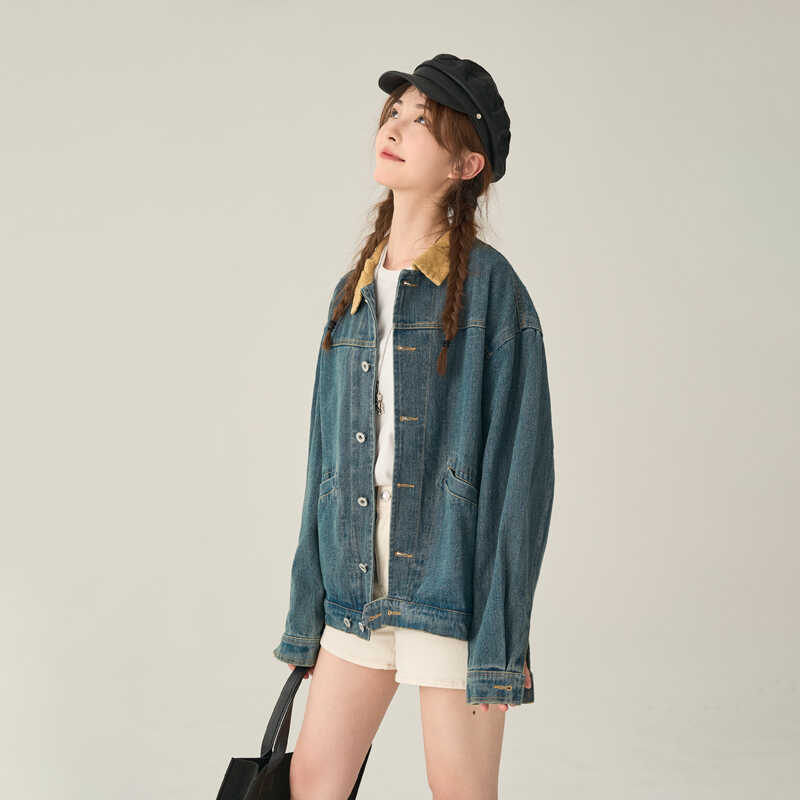 秋季百搭日系复古风做旧工装牛仔夹克灯芯绒拼色领子情侣上衣外套
