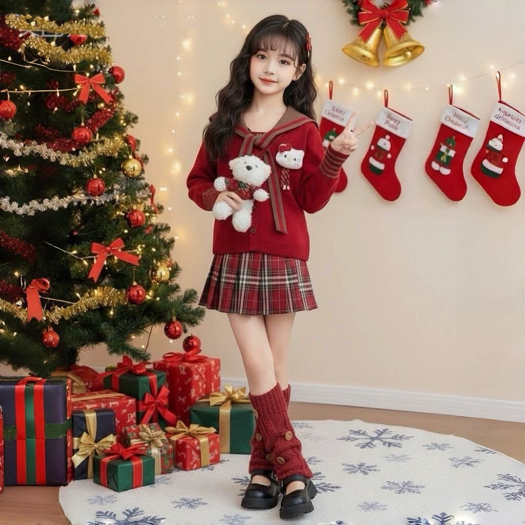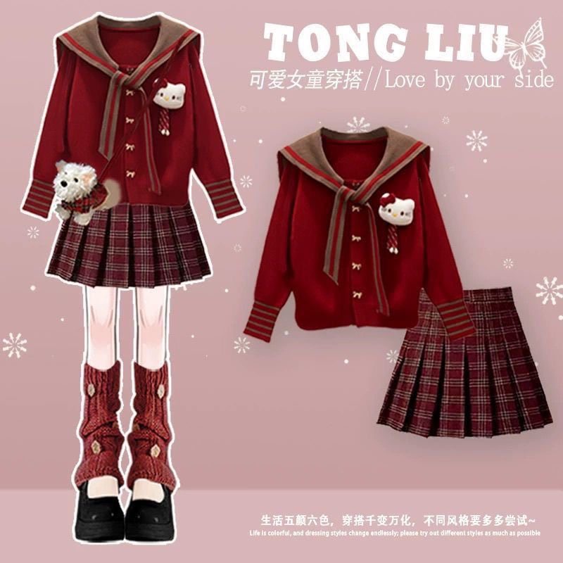 女童毛衣连衣裙红色年服秋冬装新年新款女孩加厚学院jk百褶裙套装