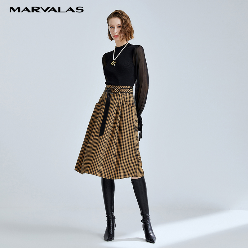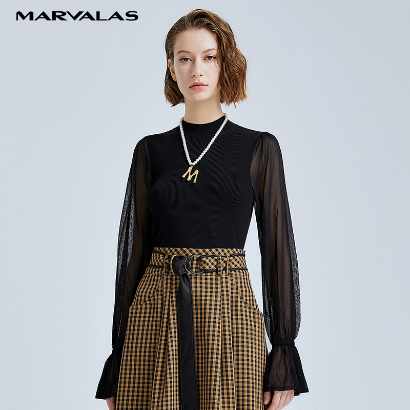 曼德诗毛衣女春装新款拼接网纱设计感针织衫简约修身打底衫