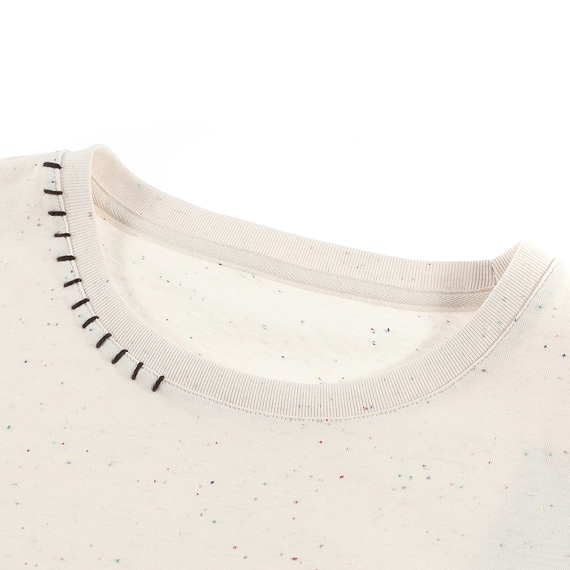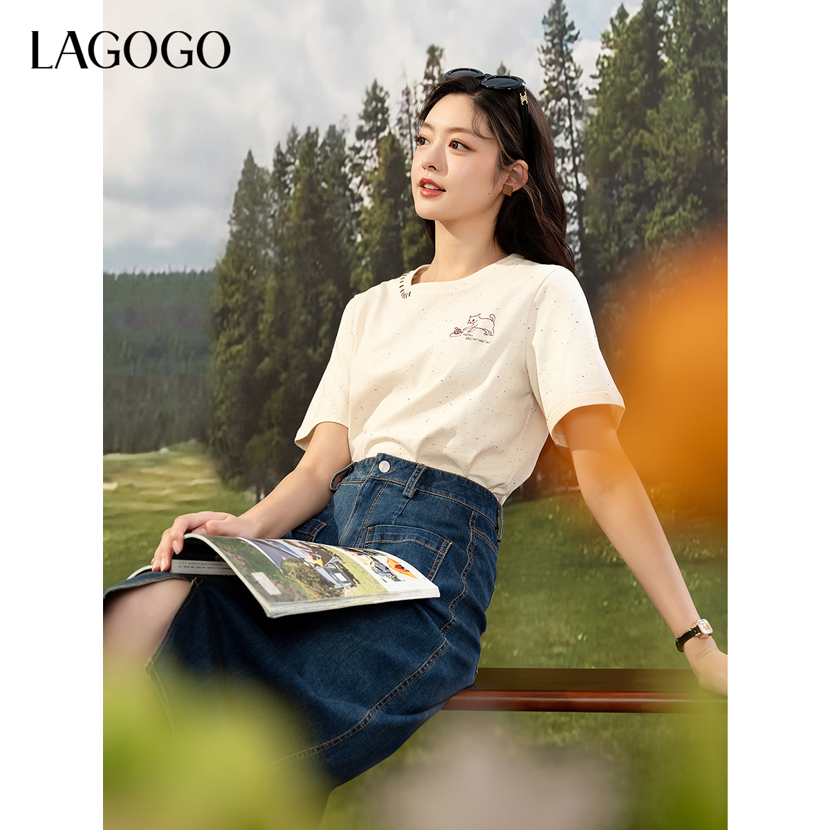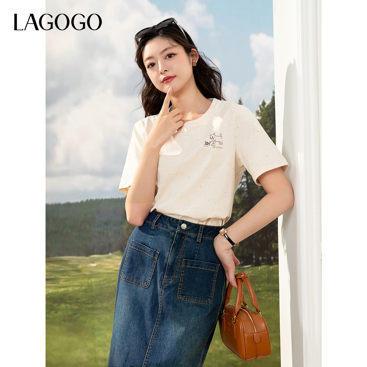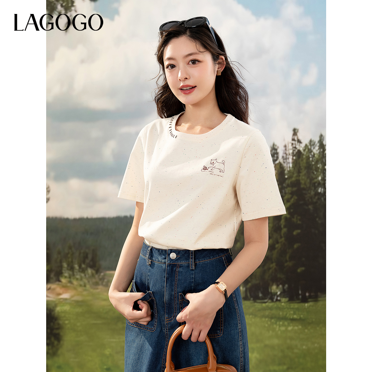 LAGOGO猫咪刺绣纯棉米白色T恤女士拉谷谷2025年新款夏日短袖上衣