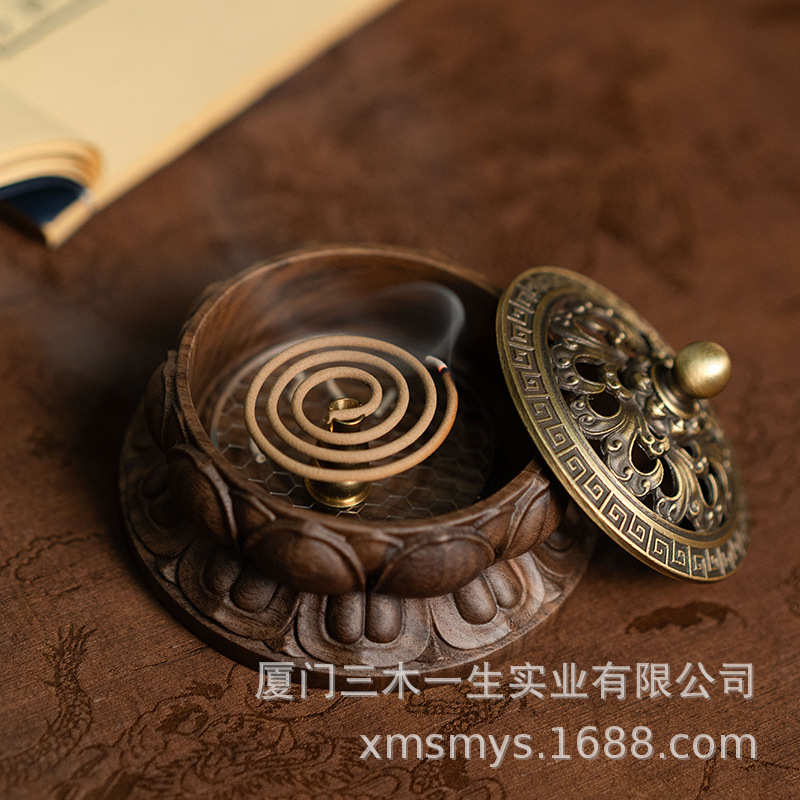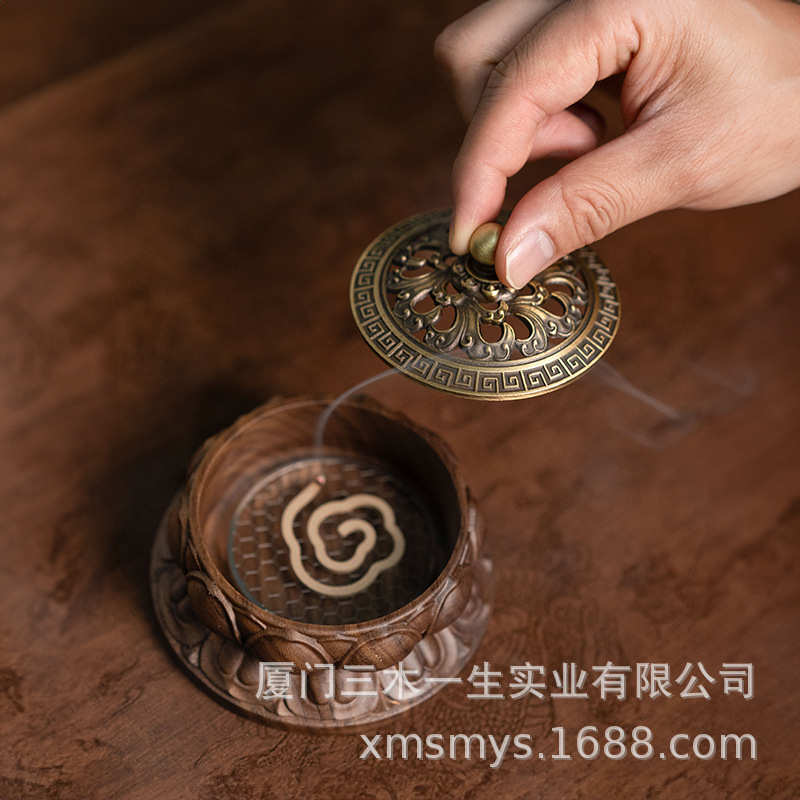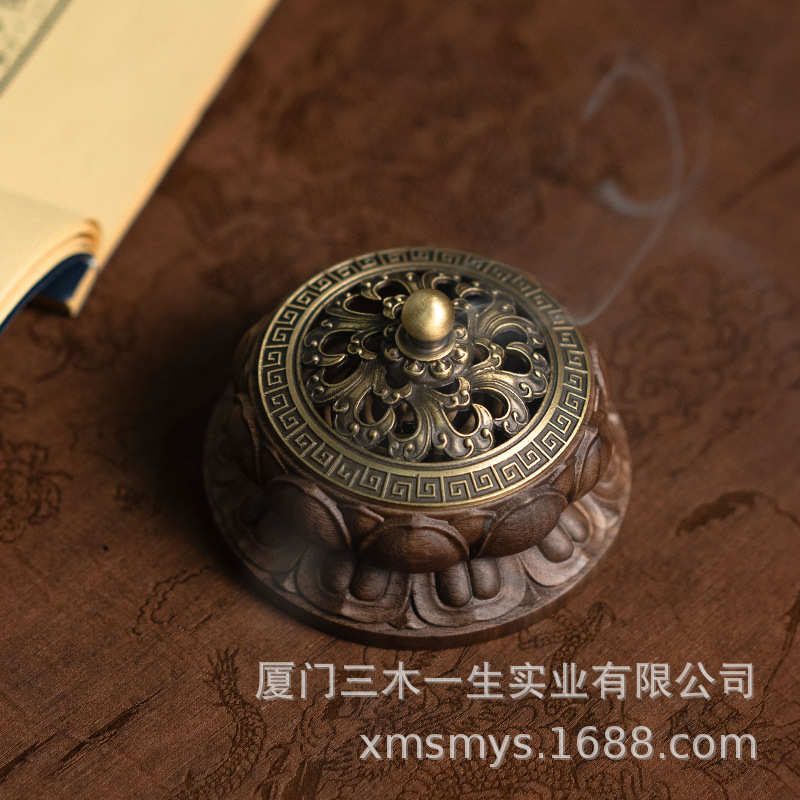 黑胡桃实木精雕香炉沉香盘熏香炉创意家用纯铜香架原木风禅意香座