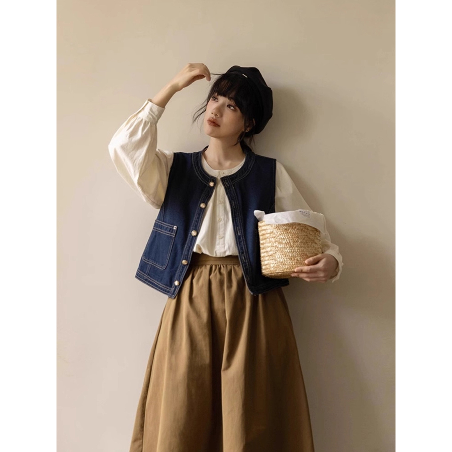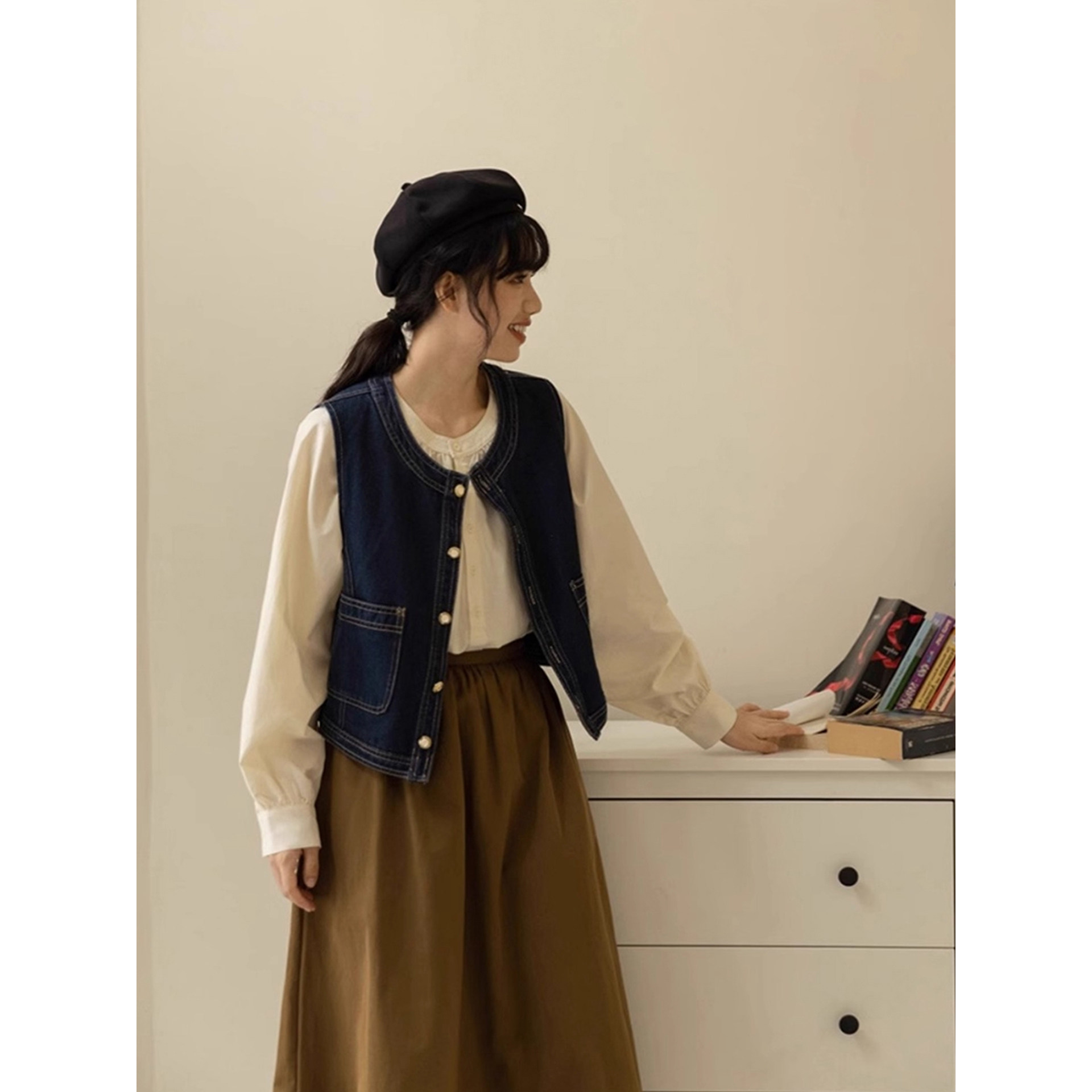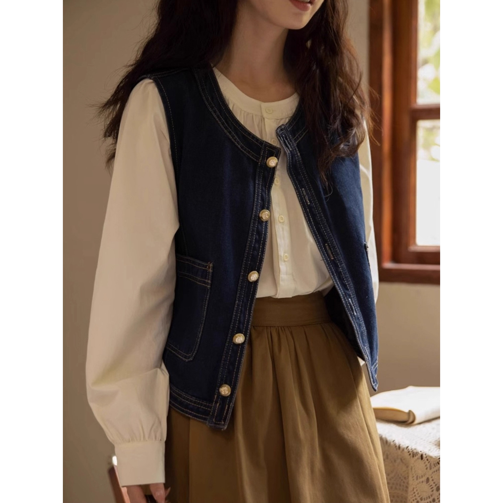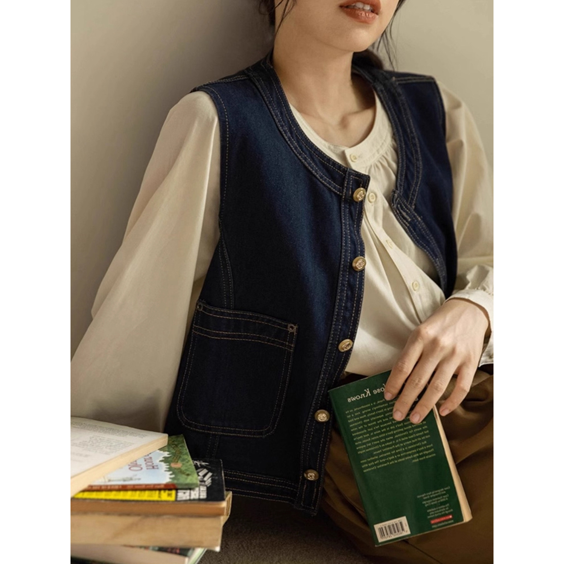 日系复古蓝色牛仔马甲女秋季叠穿背心外搭小个子坎肩马夹无袖上衣