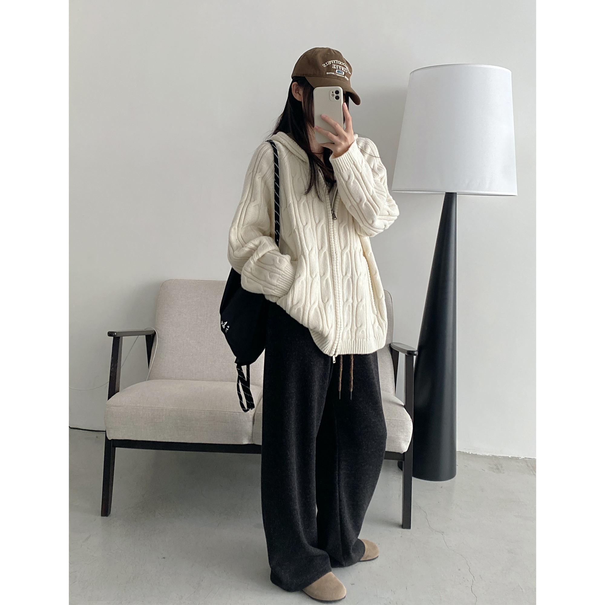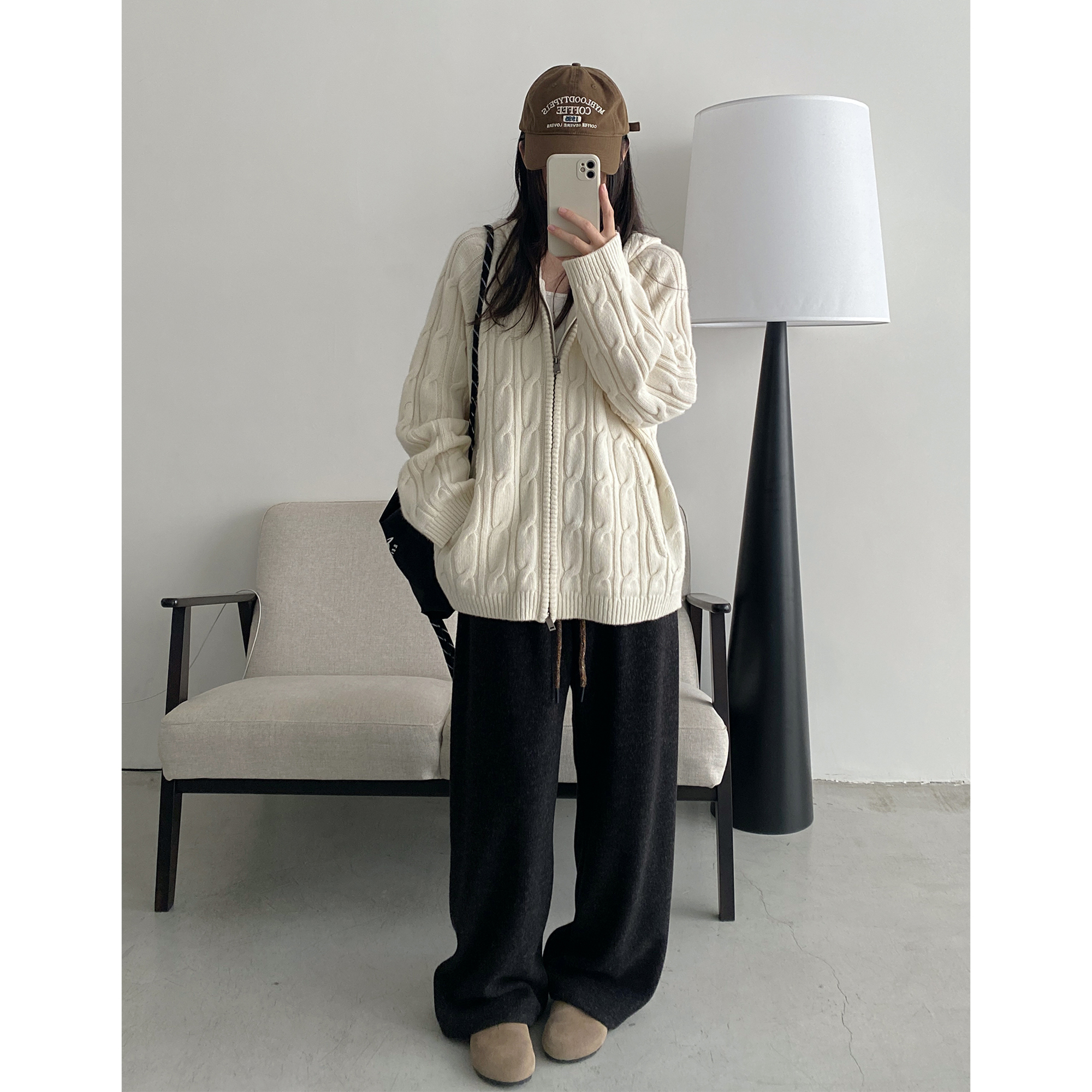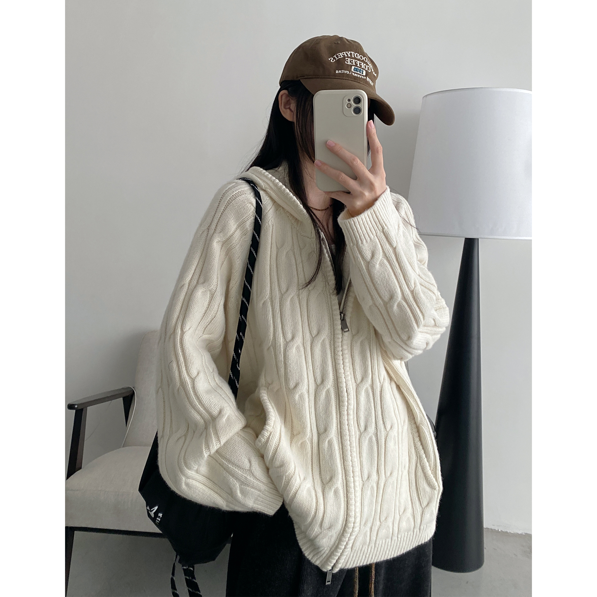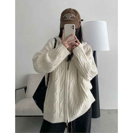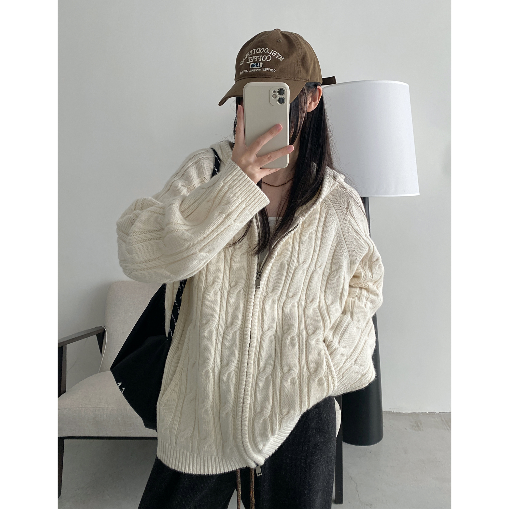sun柚 老钱调春秋季羊毛连帽麻花长袖毛衣开衫女装时尚休闲外套