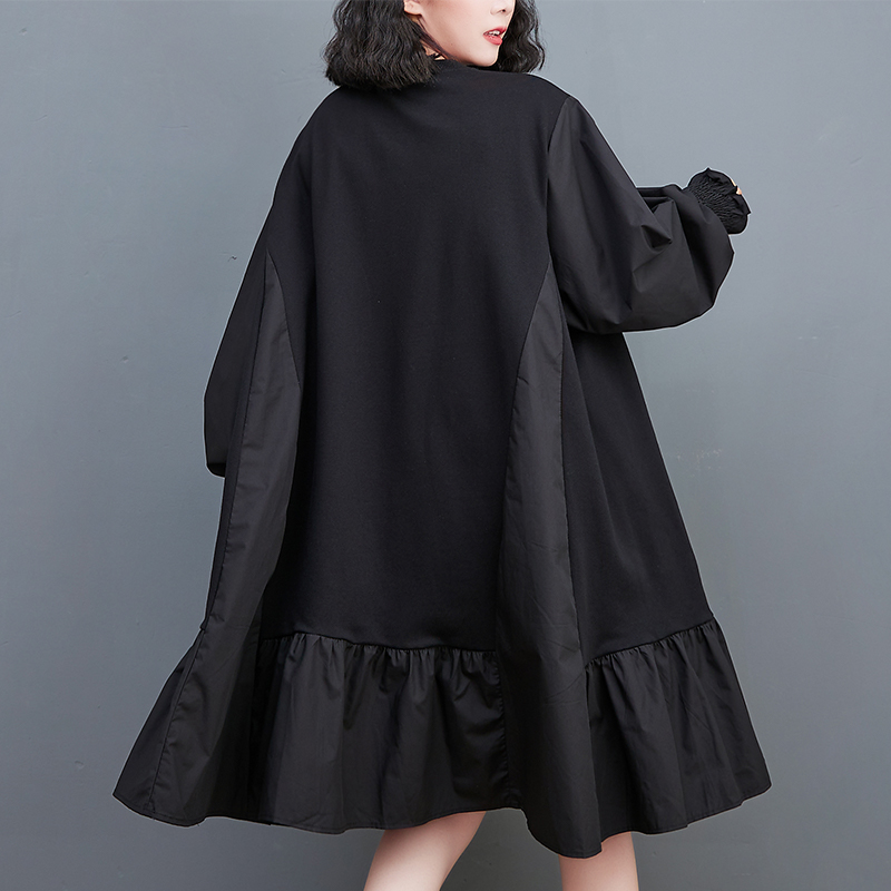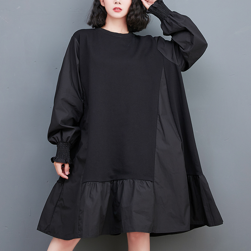 折扣年秋女韩版宽松大码圆领中长款拼接长袖卫衣连衣裙胖mm纯色