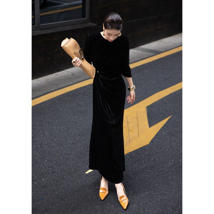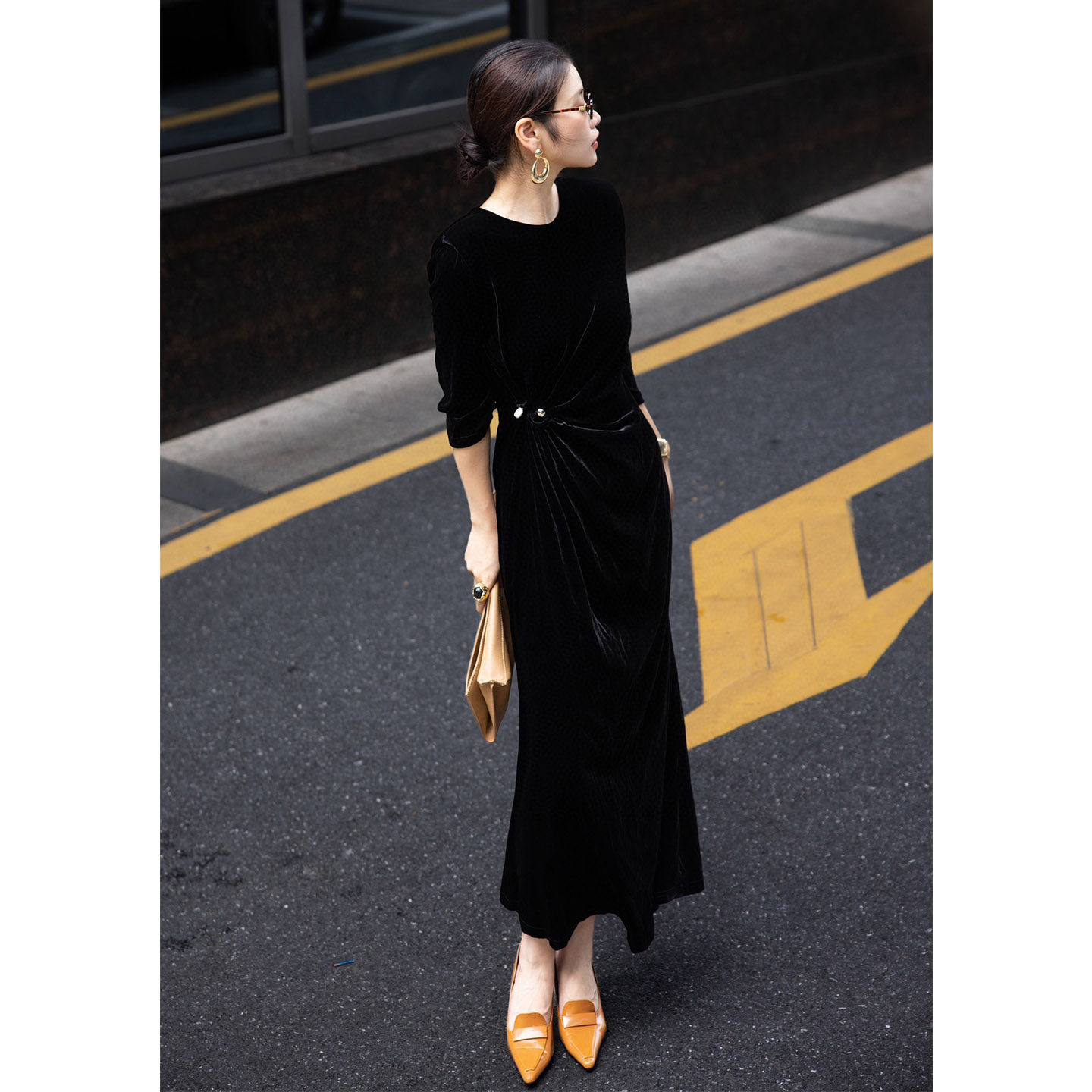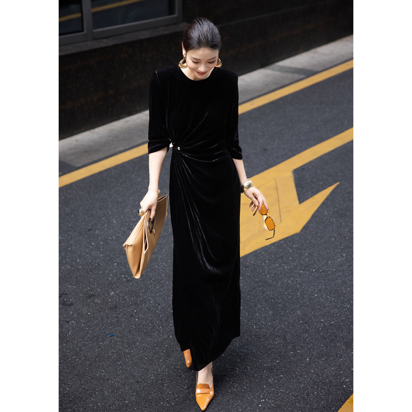 真丝丝绒连衣裙女黑色收腰显瘦气质女人味优雅长裙极简风