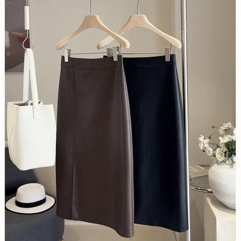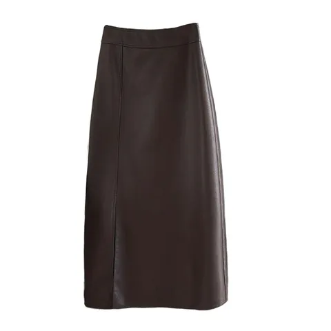PU开叉2025显瘦半身裙包臀咖色裙子女a字皮裙高腰秋季一步中长款