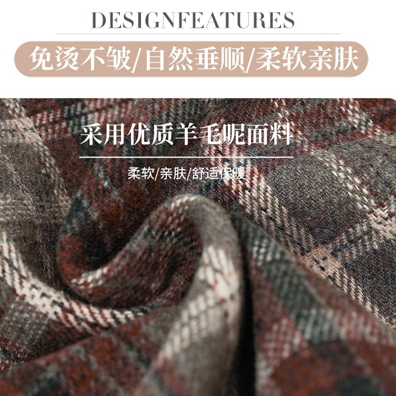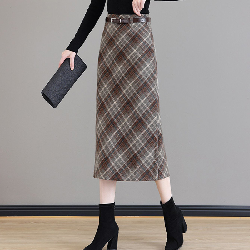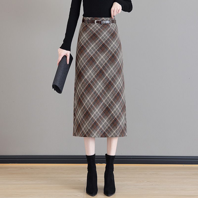 啄木鸟格子毛呢半身裙女秋冬季高腰中长款a字加厚一步包臀裙子