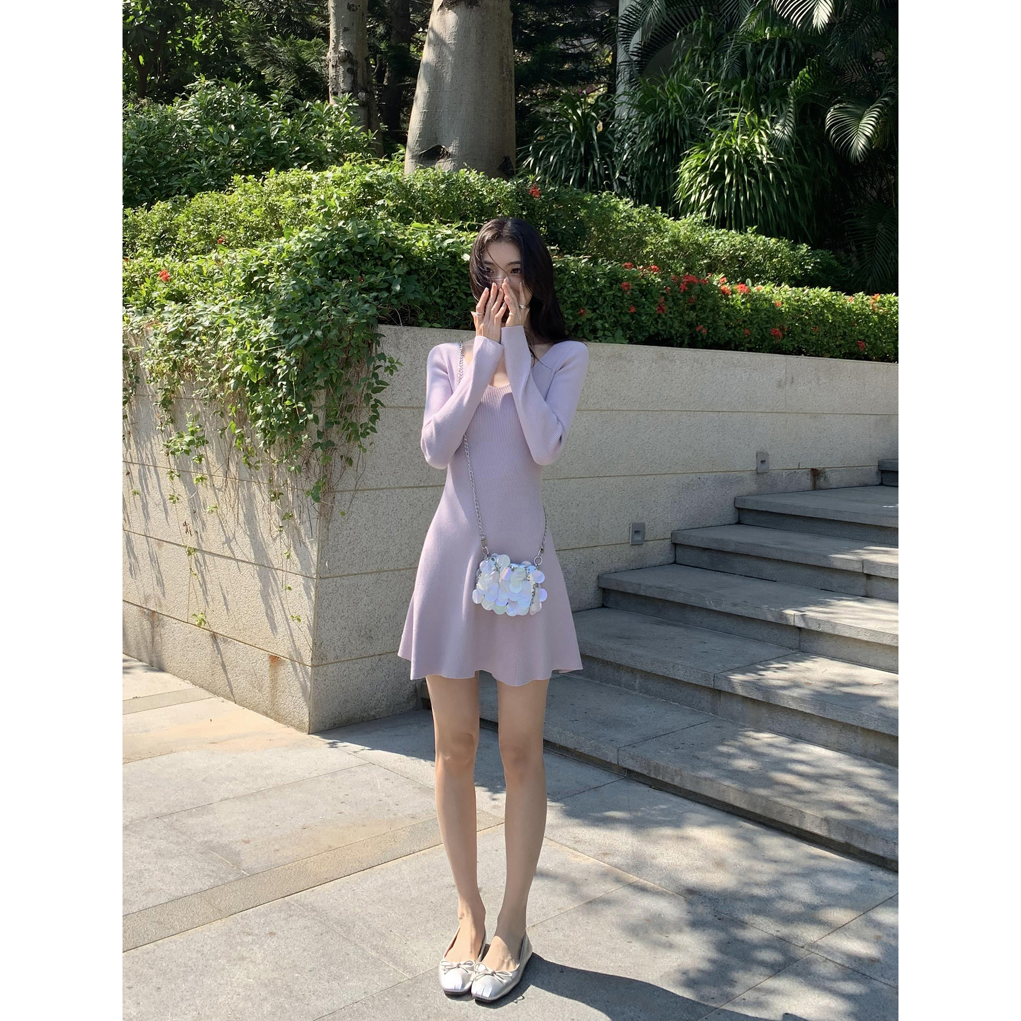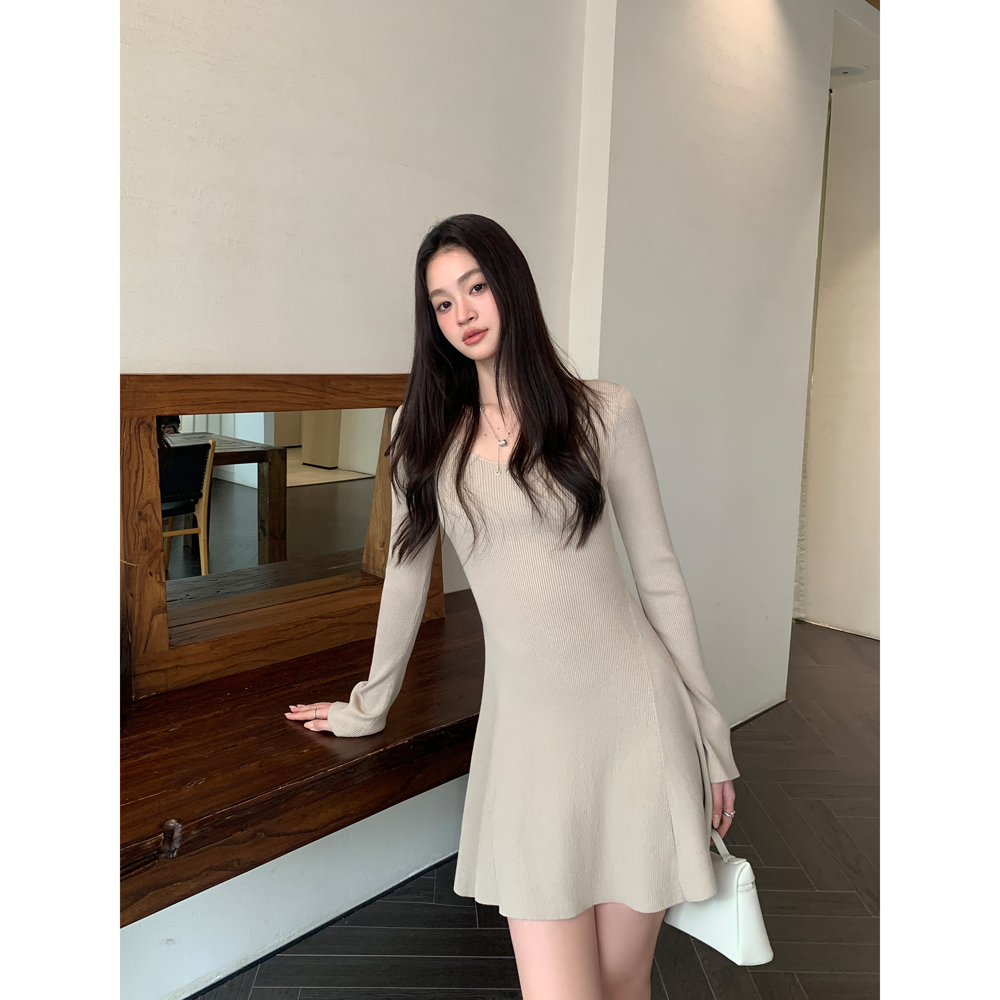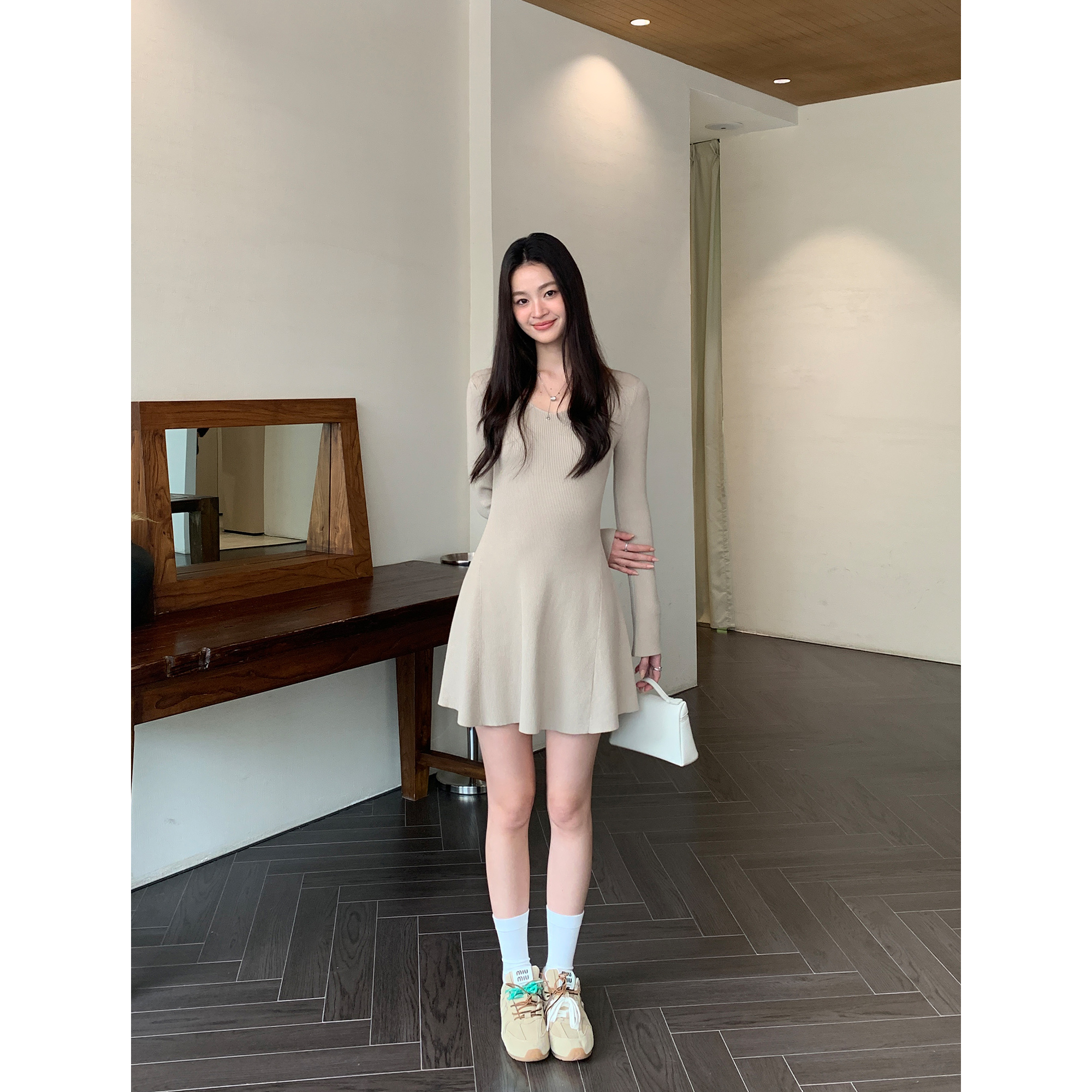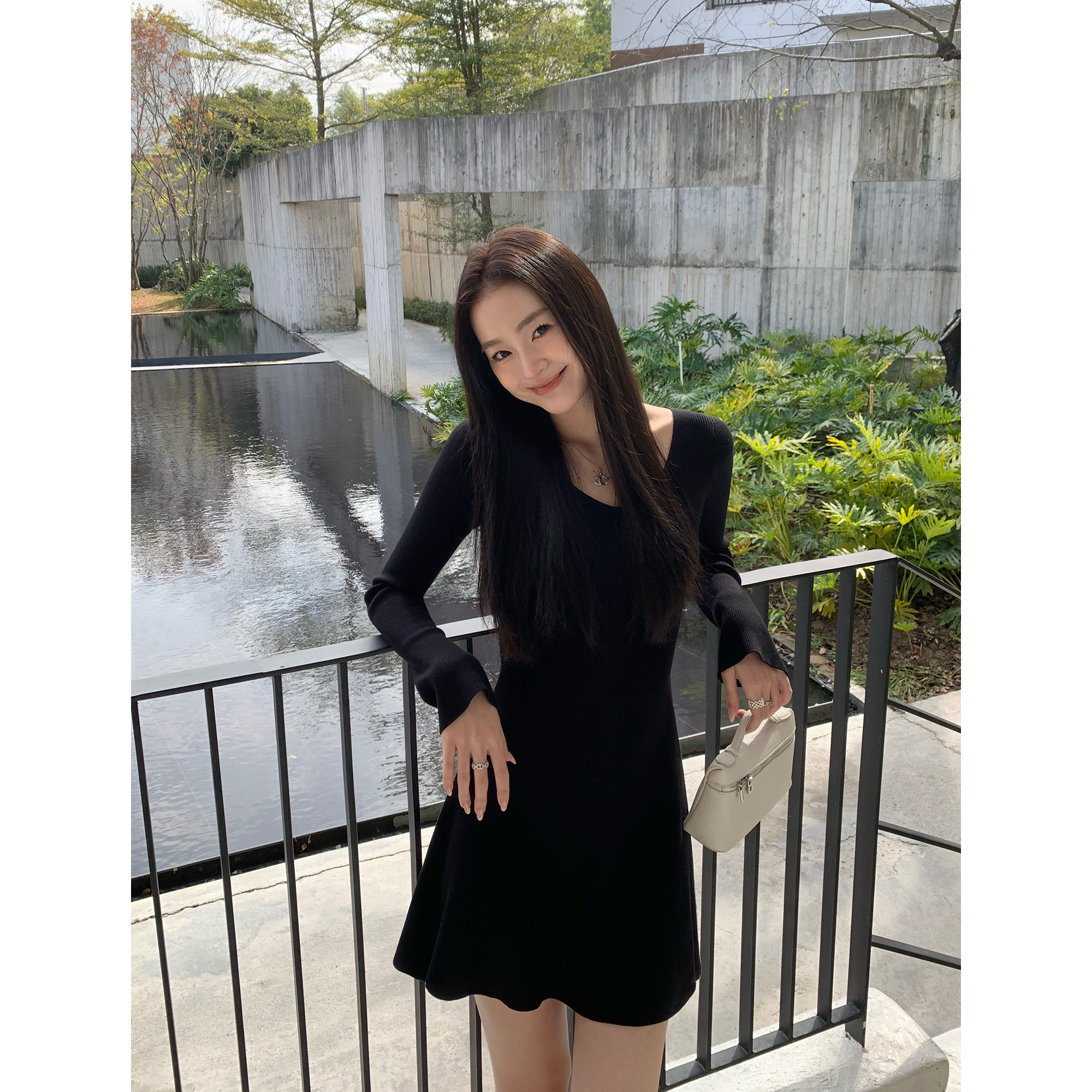 MULVAN 气质v领长袖针织连衣裙女春秋修身显瘦打底内搭裙收腰短裙