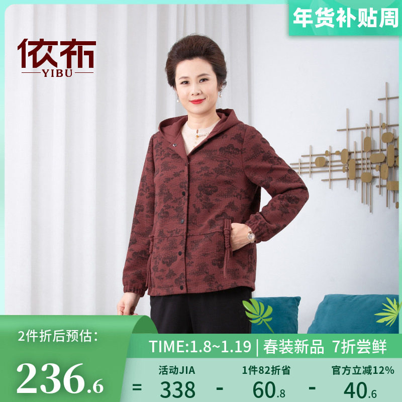 依佈中老年女士国风印花外套2026春装新款连帽开衫妈妈装大码上衣