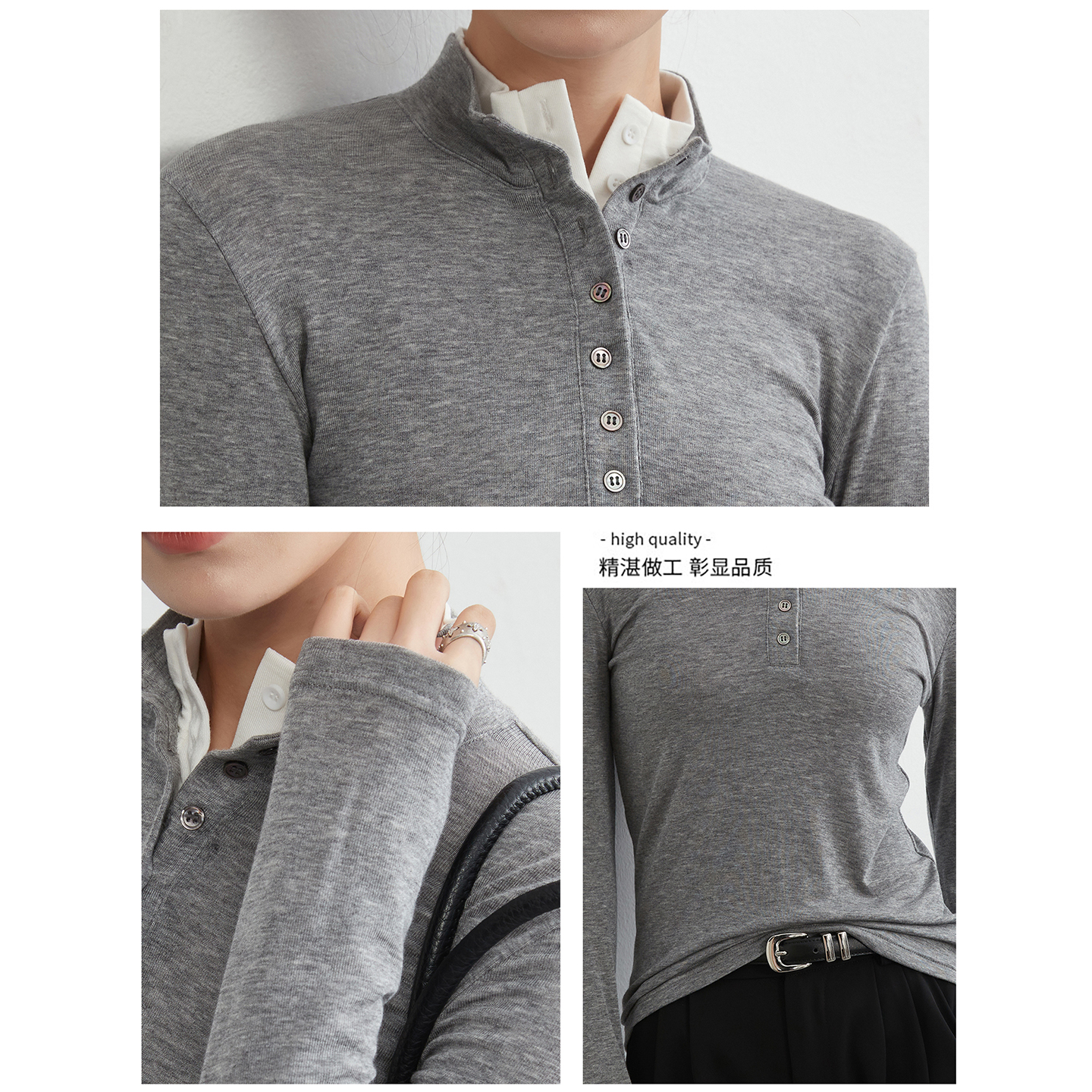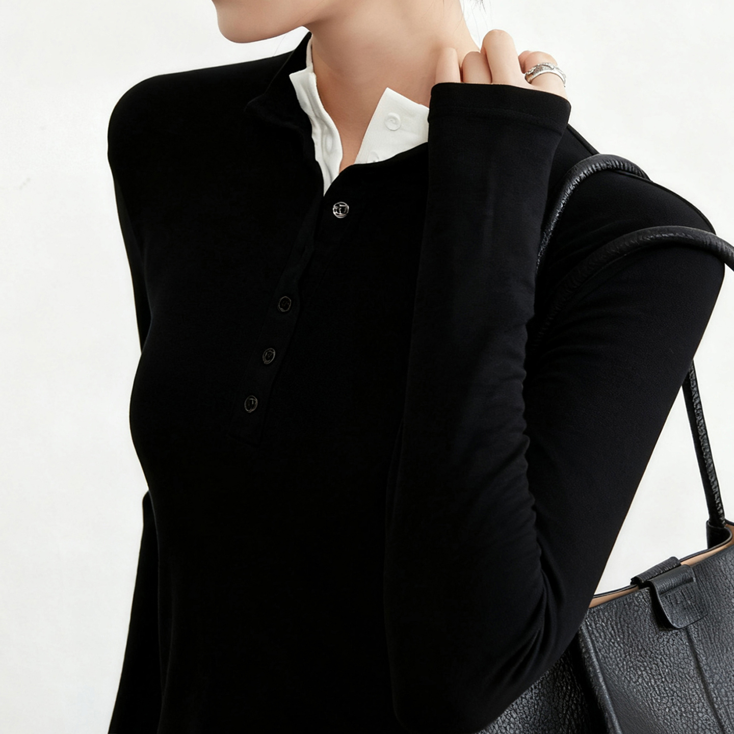 假两件打底衫女2025新秋冬修身内搭纽扣长袖衬衫含天丝羊毛T恤女