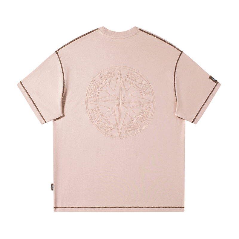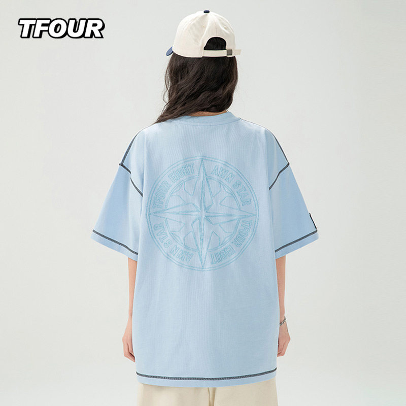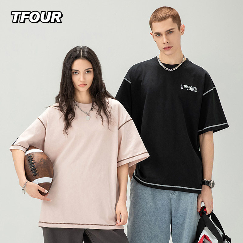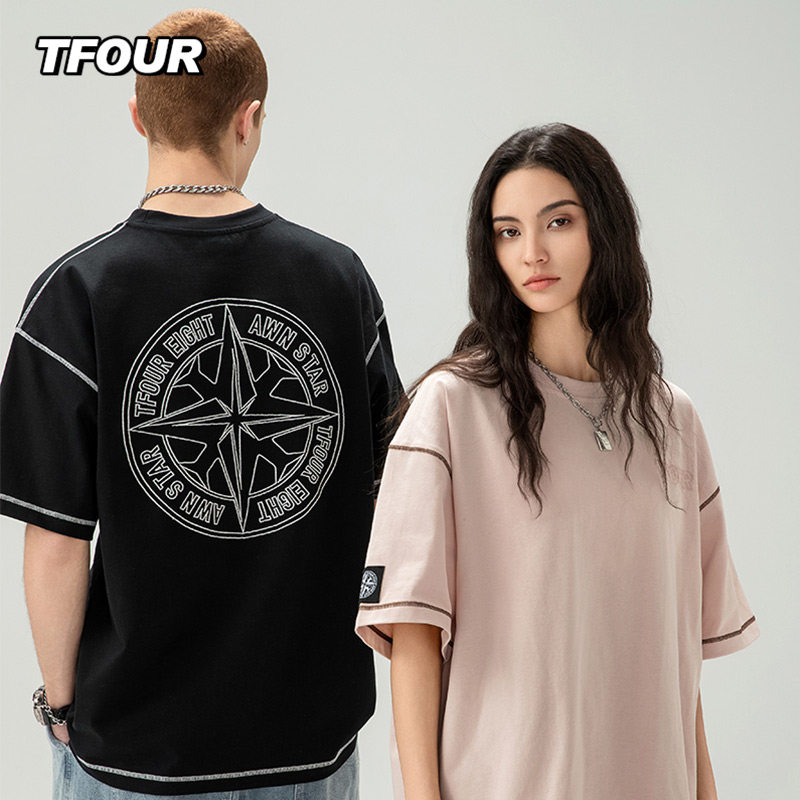 TFOUR八芒星潮牌男女刺绣T恤短袖粉色夏季新款宽松情侣装美式纯棉
