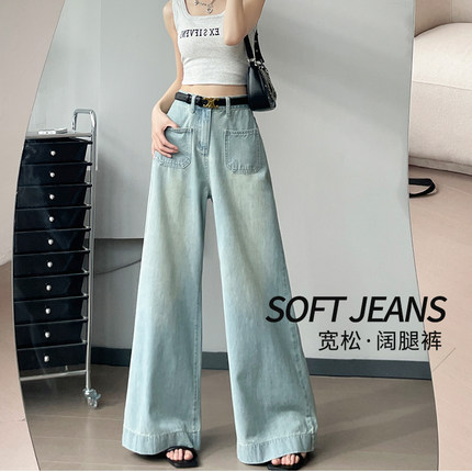 高腰微喇叭阔腿牛仔裤女春秋季2025新款浅色宽松显瘦直筒拖地裤子