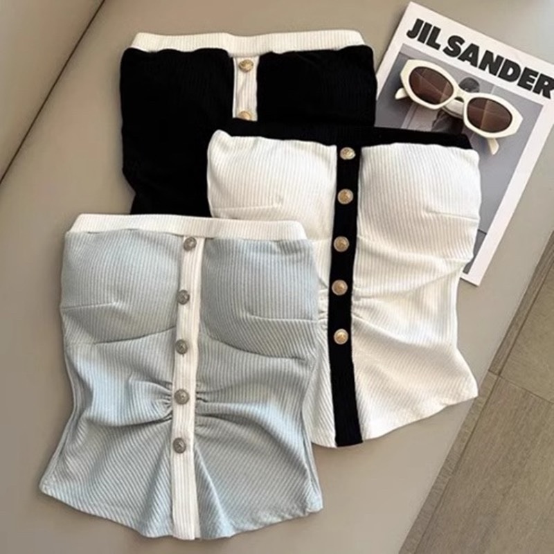韩国东大门新款时尚女人味性感显身材撞色边纽扣显胸大抹胸背心女