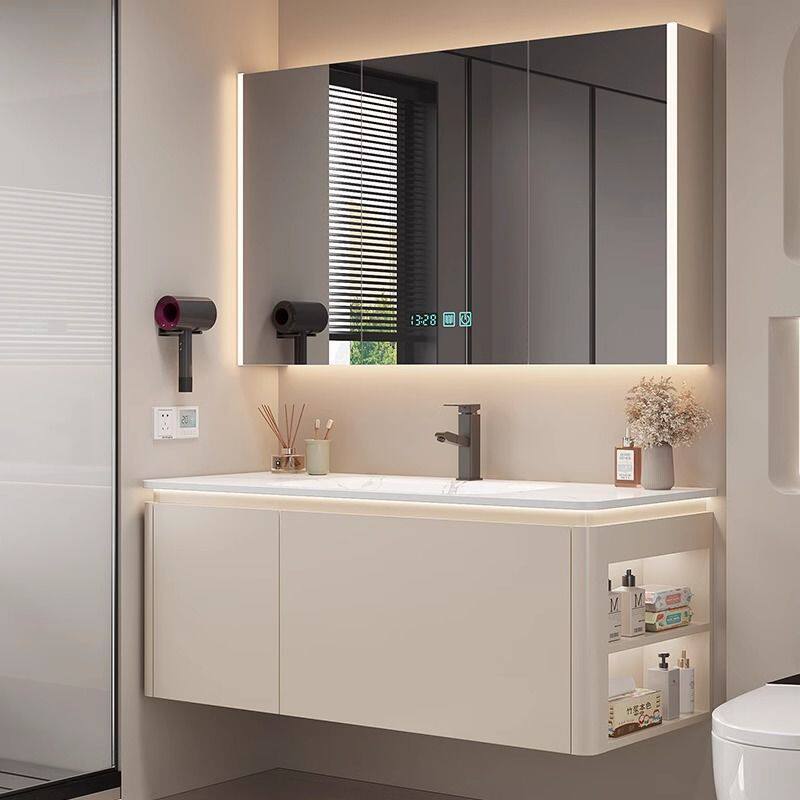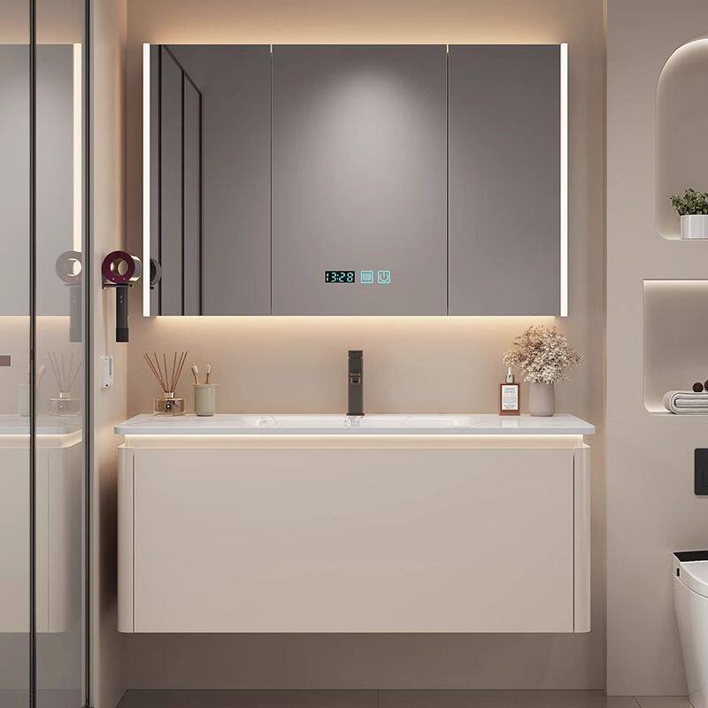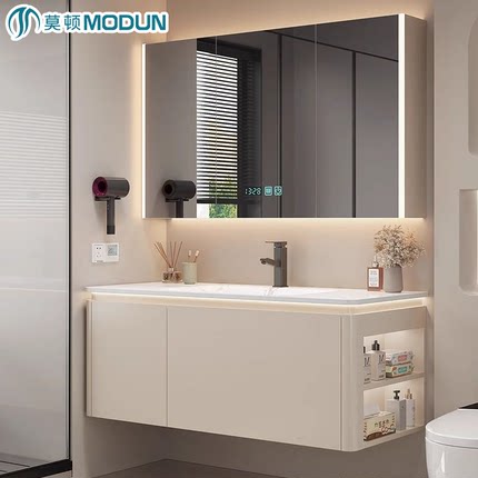 莫顿奶油风浴室柜组合岩板热弯洗脸盆卫生间洗手台池组合洗漱一体