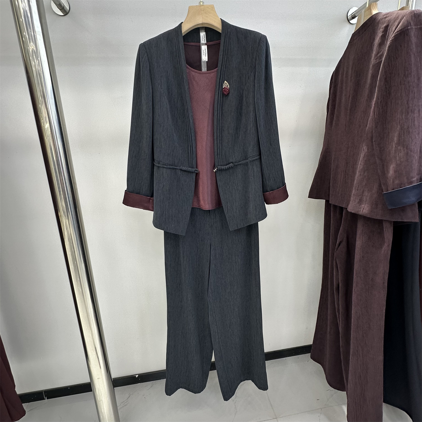 2025春秋季新款女装时尚套装紫色长袖西装外套裤子三件套春秋装